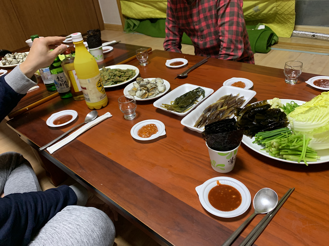 숙소로 돌아가 옆방 '관음도' 방에서의 저녁식사에 초대되었다. 소장님 부부와 소장님의 장모님, 산림청 직원 부부, 그리고 역시 소장님의 초대로 오신 이웃 식당 사장님 부부와 예비부부인 우리까지 모두 일곱 사람이 모였다. 사모님이 차려주신 과메기와 매생이굴국, 꼬막비빔밥으로 푸짐한 저녁을 먹었다. 음식 솜씨가 뛰어나신 사모님은 알고 보니 대구에서 꼬막 집을 하셨다고(무려 9호점까지 낸 유명한 꼬막집) 또 포스가 보통이 아니었던 이웃 식당 여사장님은 (사)울릉도아리랑보존회장이셨다.