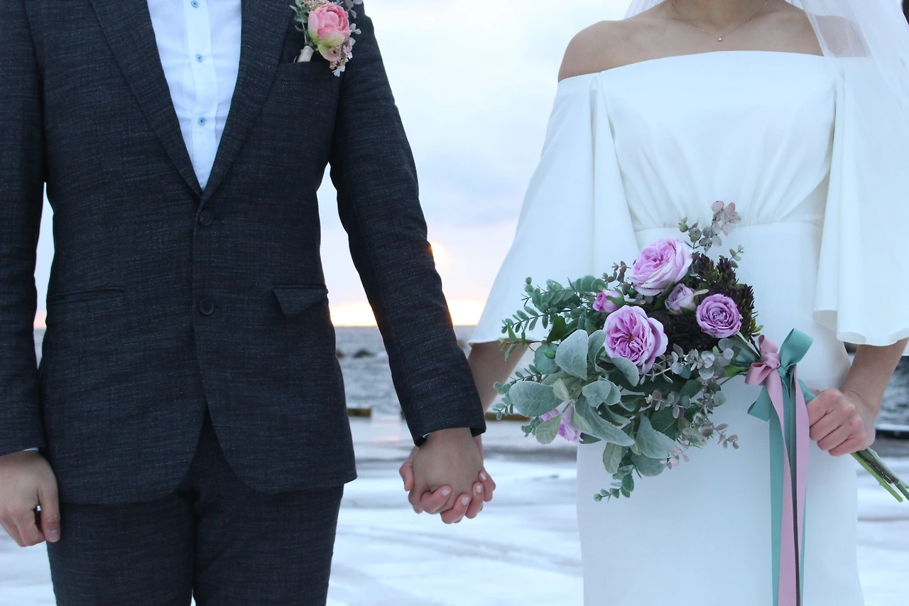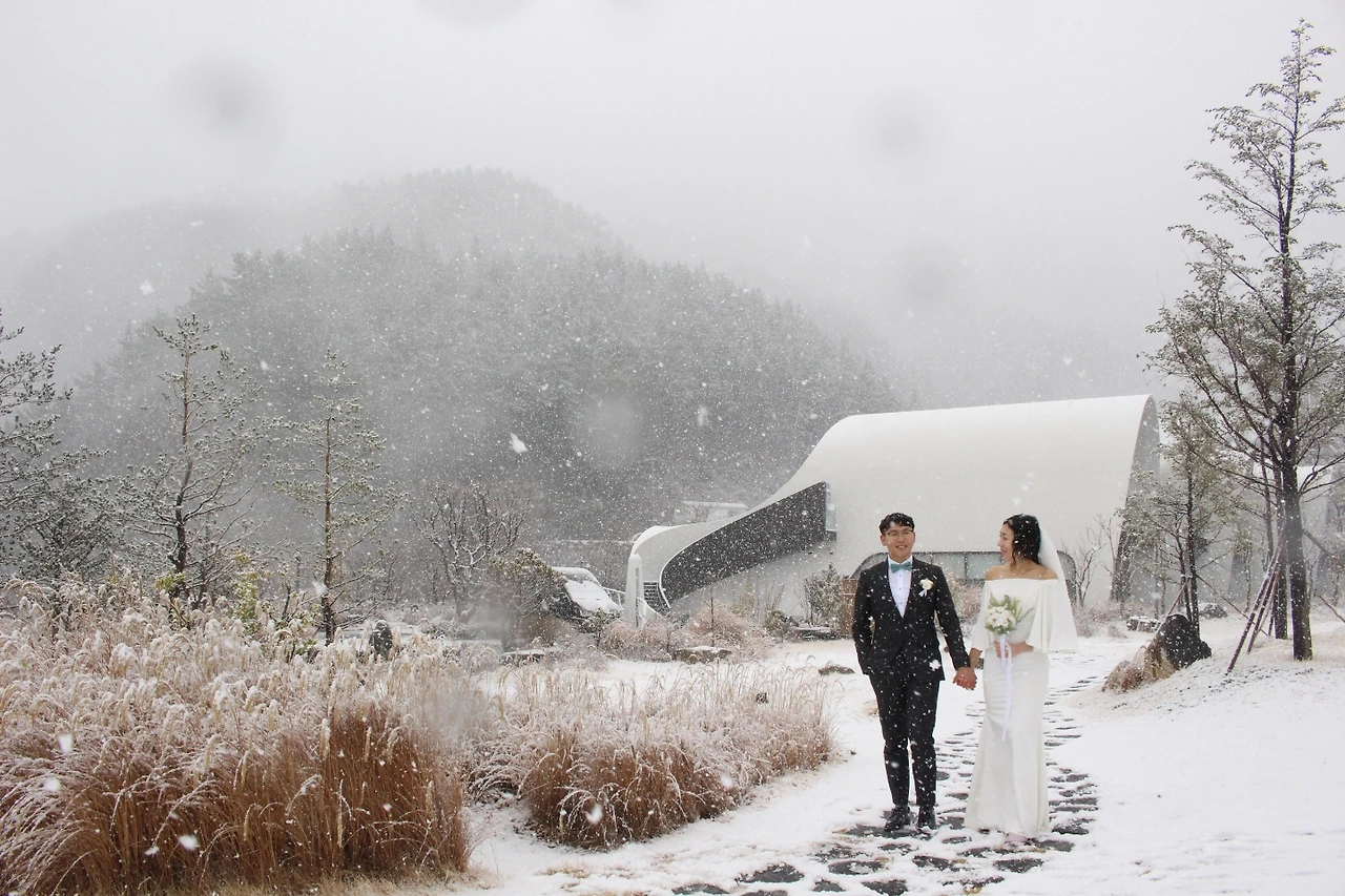 오늘이다. 이날을 위해서 얼마나 벼루었던가. 눈을 뜨자마자 창문 밖을 내다보는데 아.. 망했다. 어제의 화창한 날씨와는 달리 무척이나 흐린 게 아닌가. 게다가 눈이 온다. 심지어 소복소복 눈이 아니라 비처럼 녹아내리는 눈. 우리의 촬영은 이대로 끝인가요.. 그래도 칼을 뽑았으니 무 아니 양파라도 썰어봐야지 않겠냐며. 얼른 씻고 나는 드레스를, 콩맨은 정장을 걸쳐 입었다. 대구에서부터 소중히 안고 온 부케, 부토니에, 베일, 보타이, 구두와 장신구들도 함께 챙겨서. 각자 드레스 한 벌, 정장 한 벌에 롱패딩만 걸쳐 입고 밖으로 나섰다.