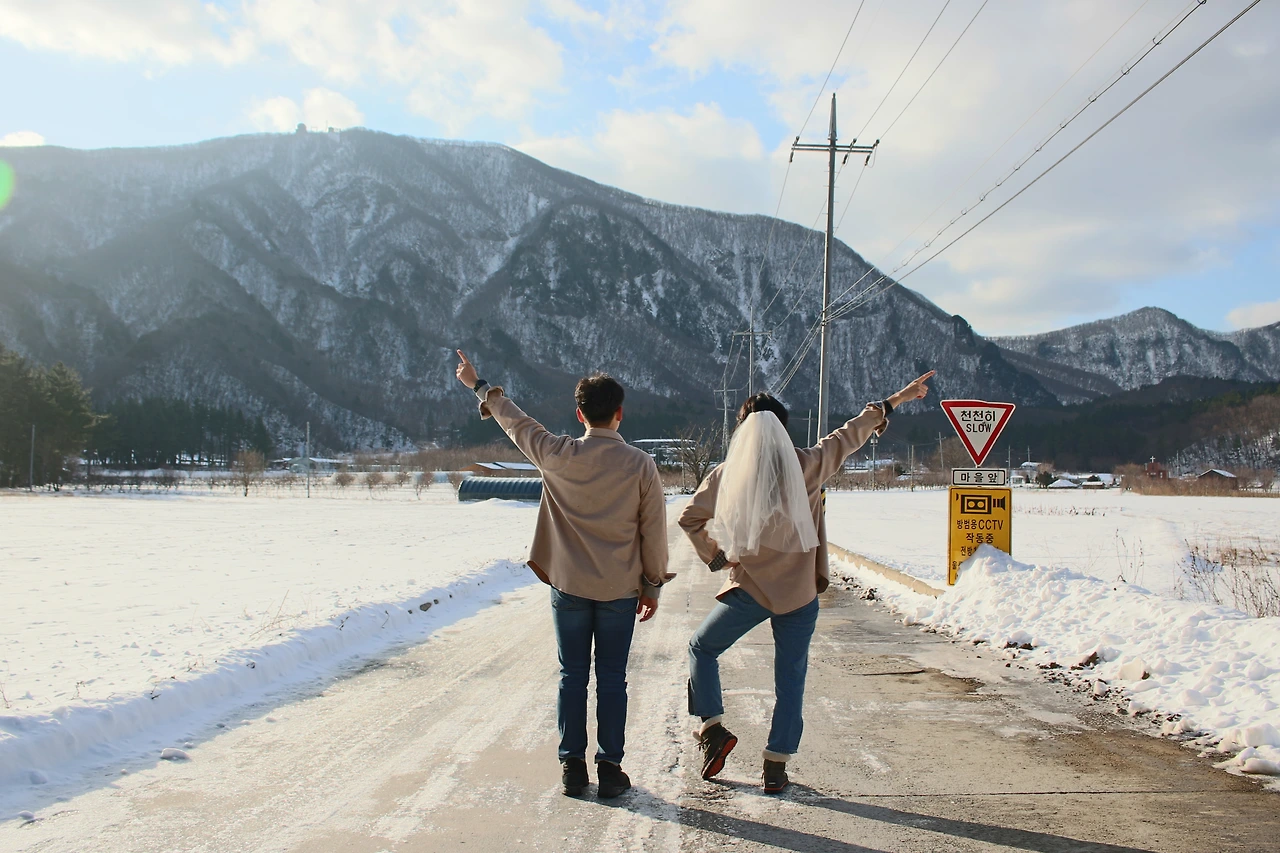 그곳에서 우리는 아무도 밟지 않은 눈밭을 정신없이 뛰어다녔고, 꼭 해보고 싶었던 영화 러브스토리의 한 장면처럼 눈 위에 누워 두팔 벌리기도 했고, 마치 다른 세상 속에 우리 둘 뿐인 것 같았다. 그도 그럴 것이 사람이 1도 없잖아. 가끔 지나가는 거라곤 군인차, kt 차뿐.. 유일하게 만난 한 사람은 휴가 나가는 나리분지 안의 부대 군인이었는데, 신기하게도 이 군인을 나중에 포항 가는 배 안에서도 또 만났다. 이러다 대구까지 같이 가는 거 아니냐며 웃었다.
