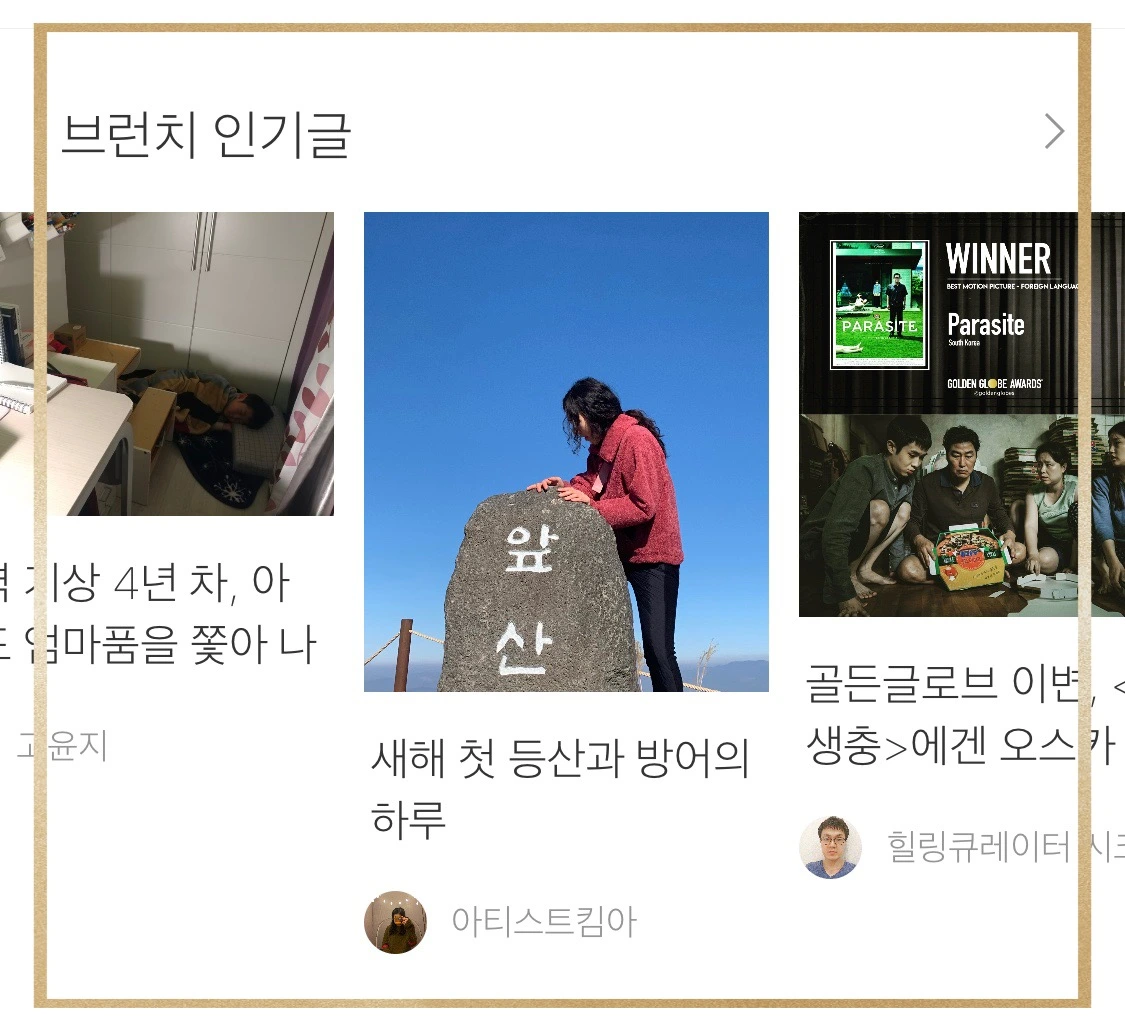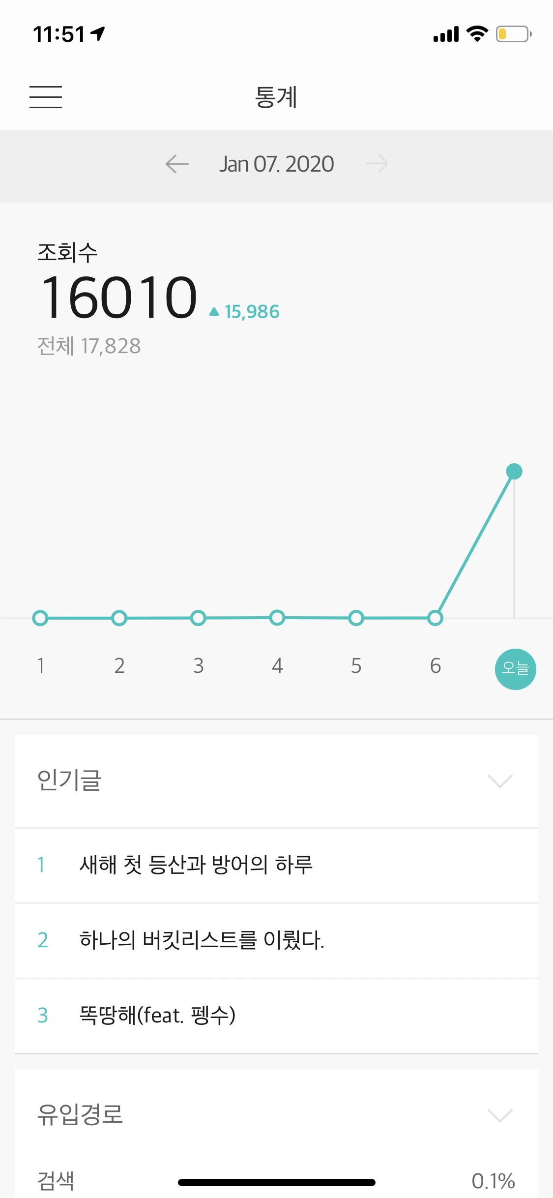 알고 보니 일요일에 올린 '새해 첫 등산과 방어의 하루' 글이 브런치 인기글 메인에 소개된 것.