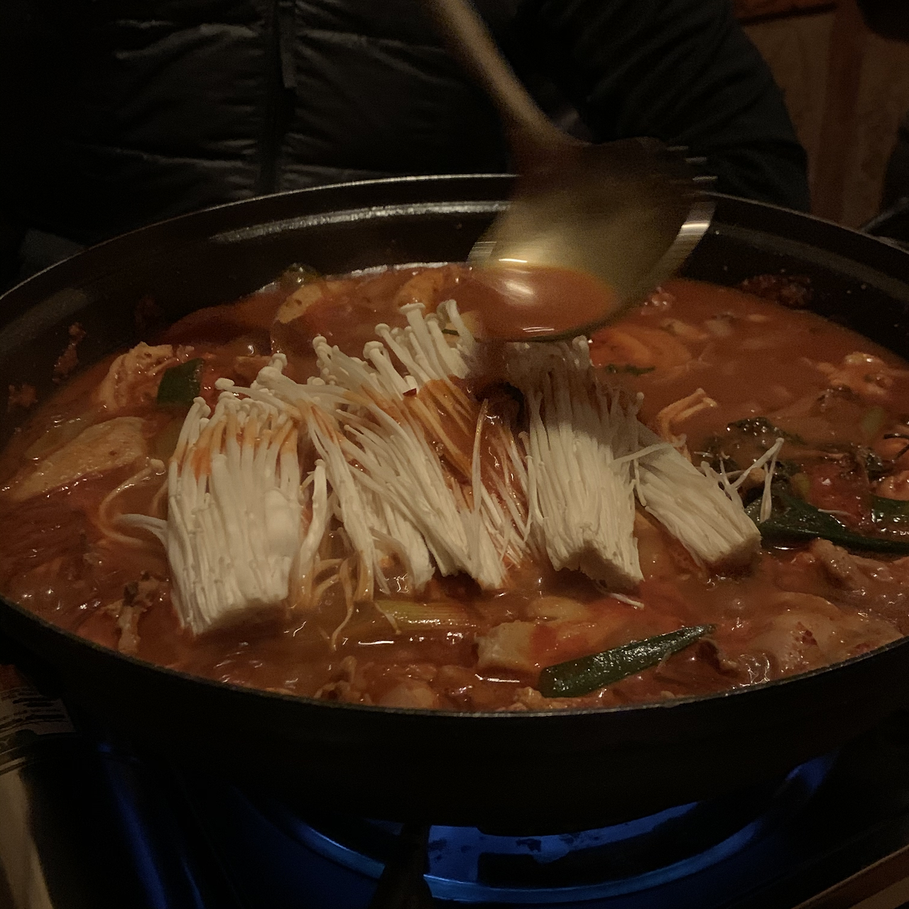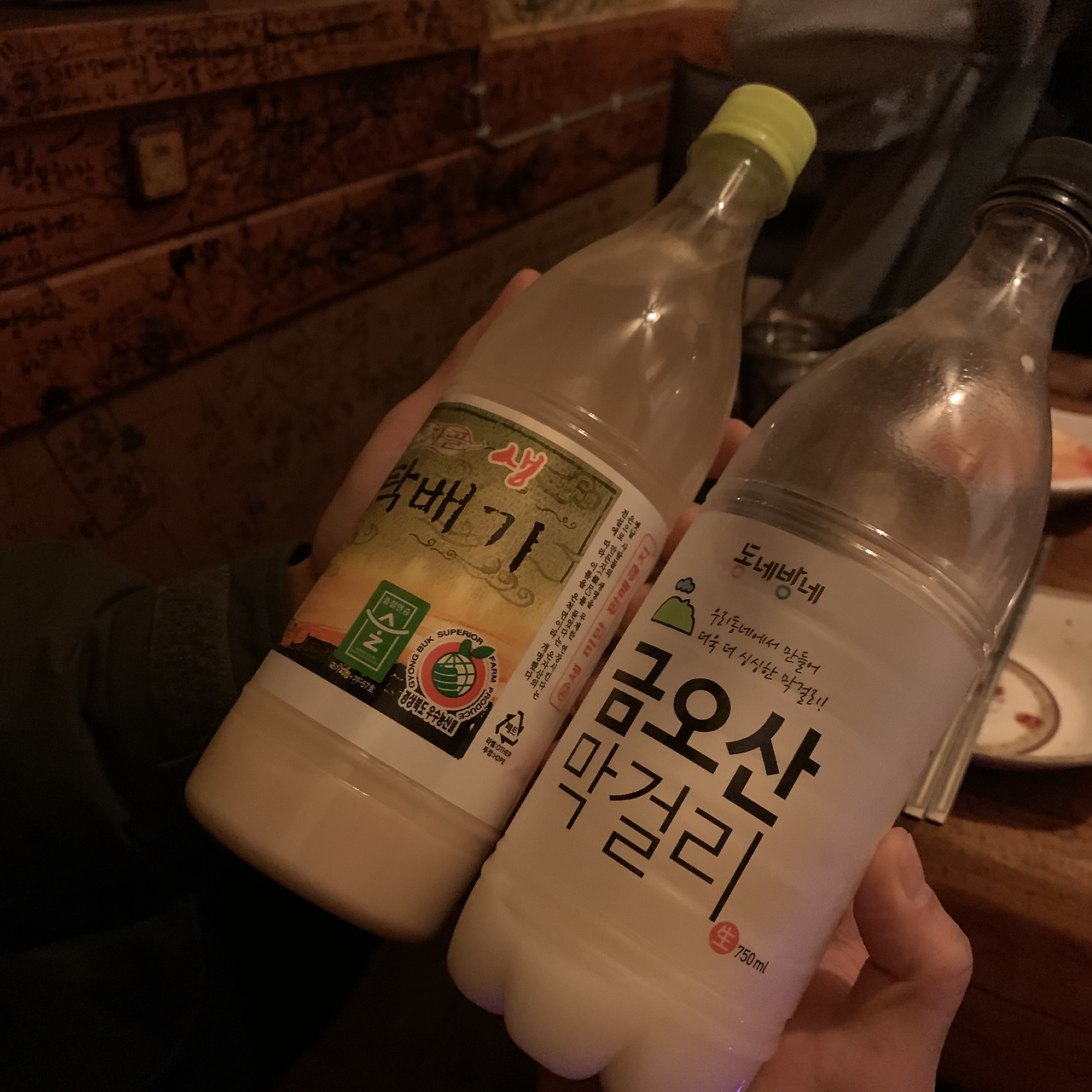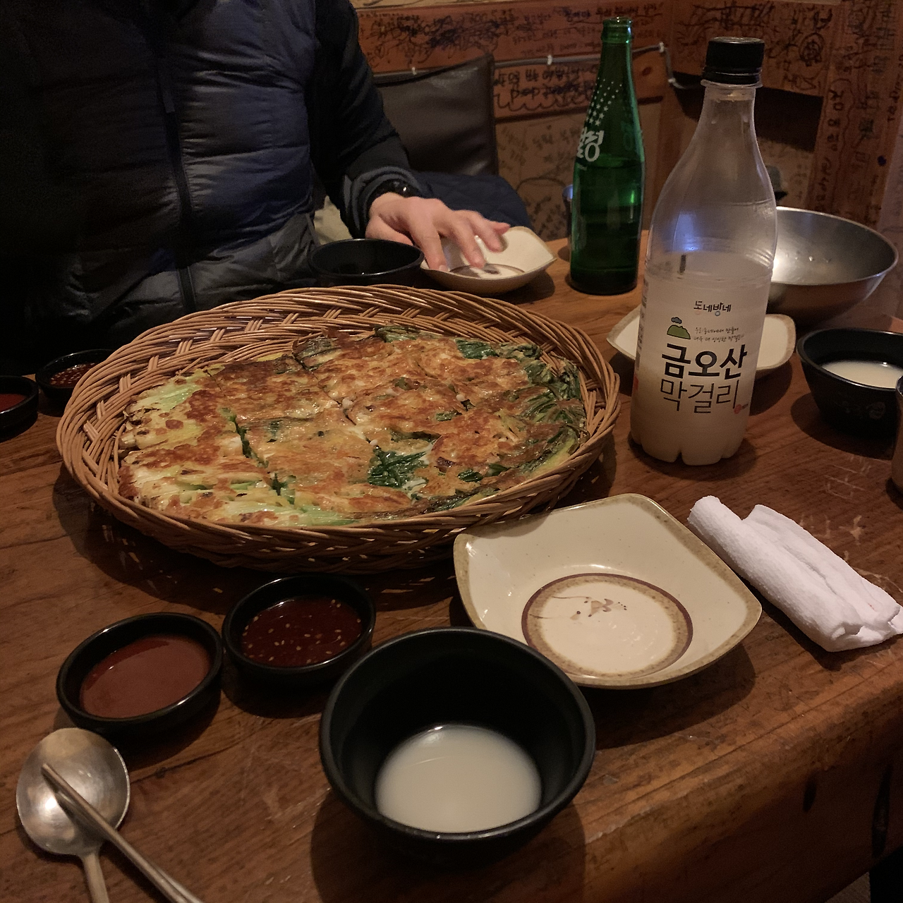 이제 우리를 기다리는 건 막걸리와 파전. 설 친구가 미리 찾아온 '선녀와 나무꾼' 대신 어느 식당 밖에 쓰여진 닭도리탕 네 글자에 이끌려 '산 따라 물 따라'에 들어섰다. 해물치즈파전으로 에피타이저를, 닭도리탕으로 본격 먹방을. 기대가 컸던 금오산막걸리도 함께. 금오산막걸리는 어쩐지 금오산을 닮아 청량감이 크고 탄산이 셀 것 같다는 내 예상을 그대로 적중했다.