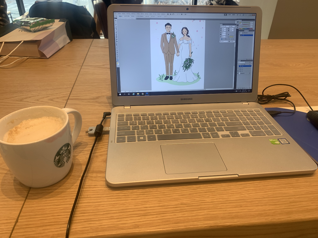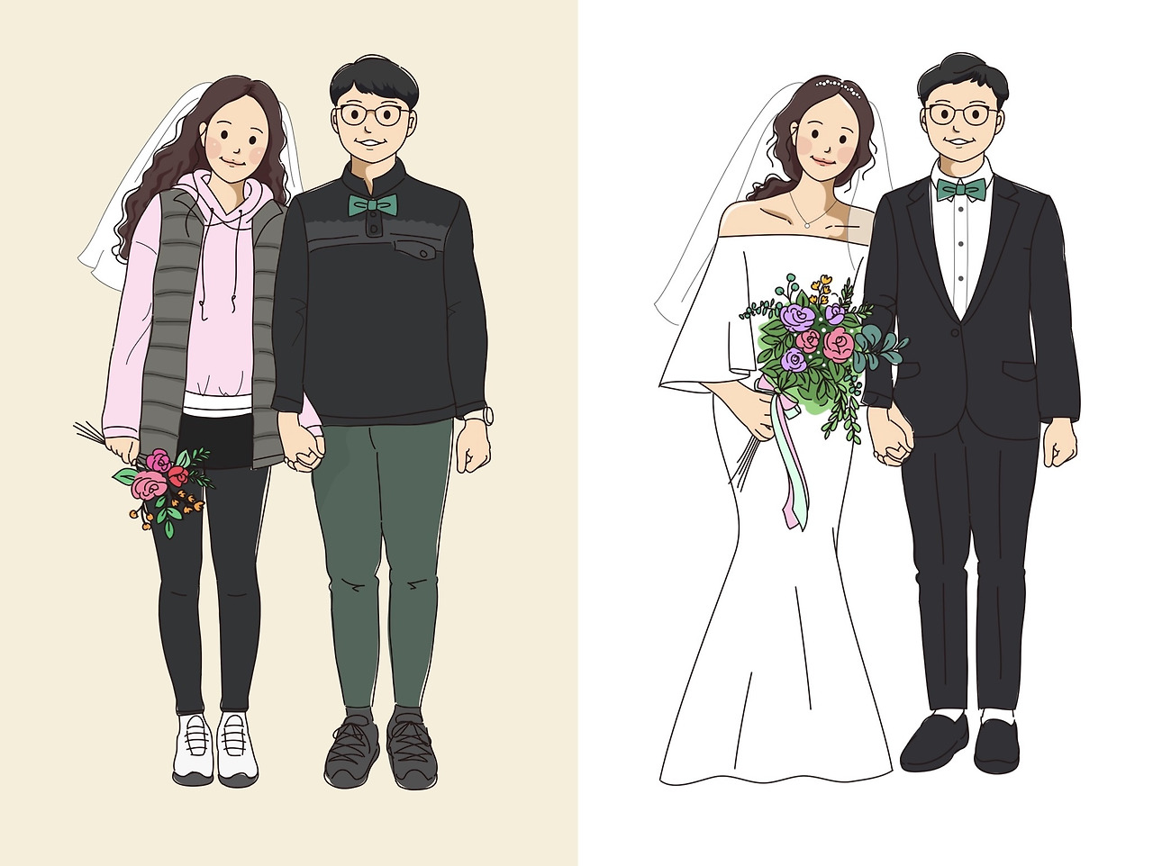 그리고 얼마 후, 콩맨과 나 우리 두 사람의 모습이 그려진 그림을 받았다. 원래 부탁한 등산복 입은 모습뿐만이 아닌 울릉도 가서 찍은 셀프 웨딩 촬영 때의 우리 모습까지. 콩맨은 그냥 그의 모습 그대로 싱크로율 100000%. 정말 마음에 들었다.