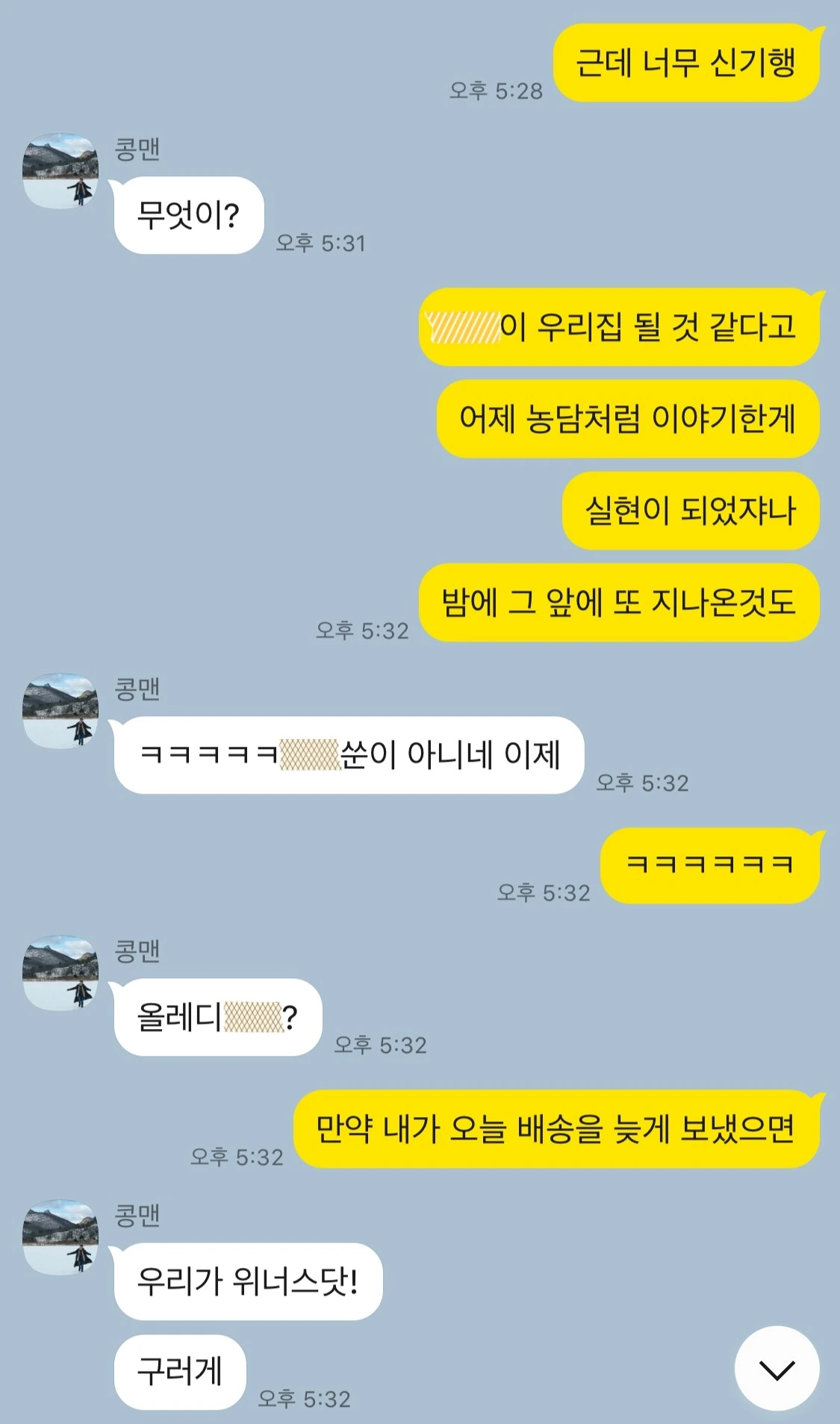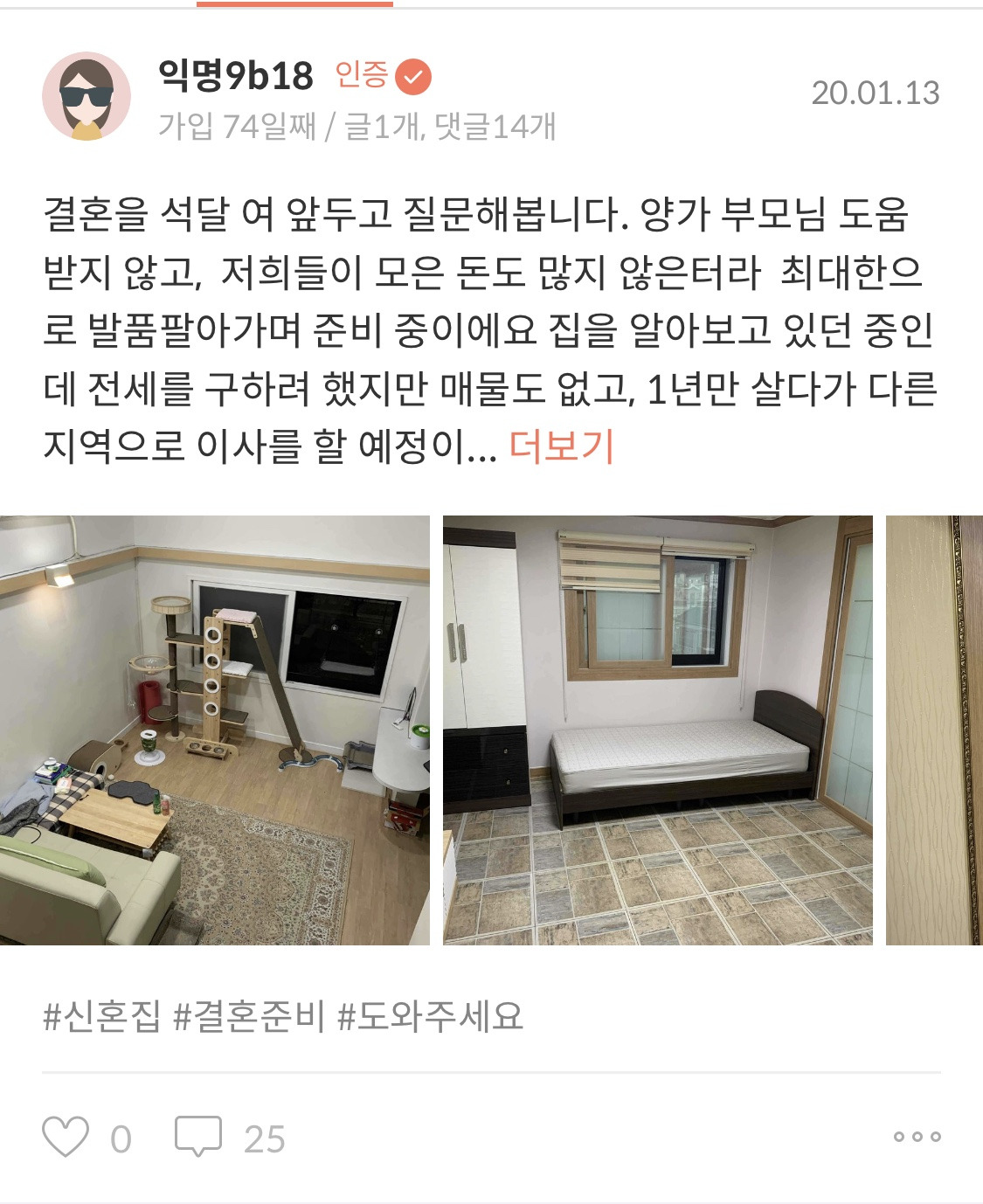 그날 밤, 심지어 눈팅만 하던 웨딩커뮤니티에 다른 예신예랑들의 의견을 묻는 글까지 올렸다. 댓글도 제법 많이 달렸다. 어쨌든 E집이 우리의 머릿속에서 떠나지 않았고. 그래, 짧게 살자. 신혼 때니까 살아보는 거야, 그리고 떠나자! 하고서 다음날, 황부장과 연락했지만 "지난밤 두 분 가시고 나서 다른 사람이 보자마자 계약했어요." 라는 슬픈 소식. 대신 처음 우리가 인터넷으로 마음에 들었던 C집의 투룸이 나왔단다. 영덕 간 콩맨 대신 엄마를 불러 황부장의 집 투어에 동행했다. 동네 좋고, 신축이고, 관리 잘되고.. 이번엔 투룸이라 넓고 다 좋은데... 마음이 안 간다. 원격으로 콩맨에게 카톡으로 사진을 보냈는데 그도 같은 반응이다. 우리에겐 이미 묻따말 E집. 이 마음을 알고 황부장이 1월 말에 계약이 끝나는 다른 세입자가 있는데 이 사람이 연장만 안 하면 방이 또 나올 수 있단다. 무조건 연락 주세요! 저희한테! 신신당부를 했다.