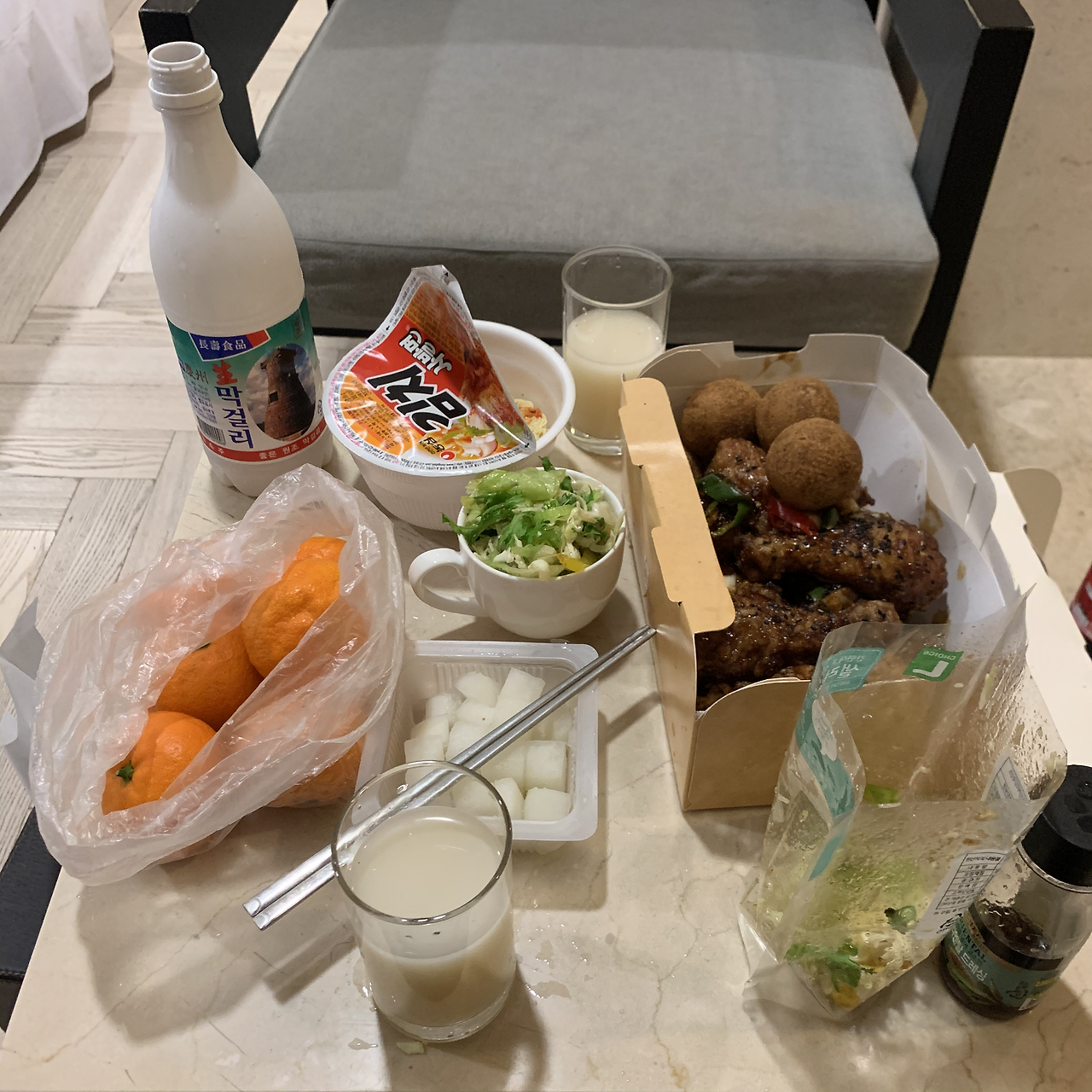 치킨러버들은 경주까지 와서도 치킨 노래를 부른다. 아니 내가 너무 좋아해서 그가 맞춰주는 것 두 가지 치킨 앤 떡볶이. 어쨌든 bhc의 블랙올리브나 맛초킹이 먹고 싶었고 마침 그에겐 친구에게 받은 맛초킹 쿠폰이 있었으니, 멀어도 주문을 해서 찾으러 가기로 했다. 가는 길에 아직 몸이 좋지 않은 그를 위해 약국을 들렀으나 문이 닫혀 편의점에서 판피린을 샀고. 마트에 들러 곡주커플에게 빠질 수 없는 막걸리와 함께 과자와 아이스크림도 샀다. 참 치킨 먹을 때 샐러드 꼭 찾는 별난 내사랑을 위해 샐러드와 드레싱도. 마지막으로 치킨을 찾아 호텔로 돌아왔다. 차 안에서 포장한 치킨 냄새를 맡는 것만큼 지독한 고문은 없다며ㅠㅠ