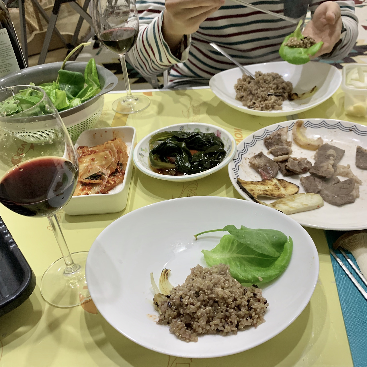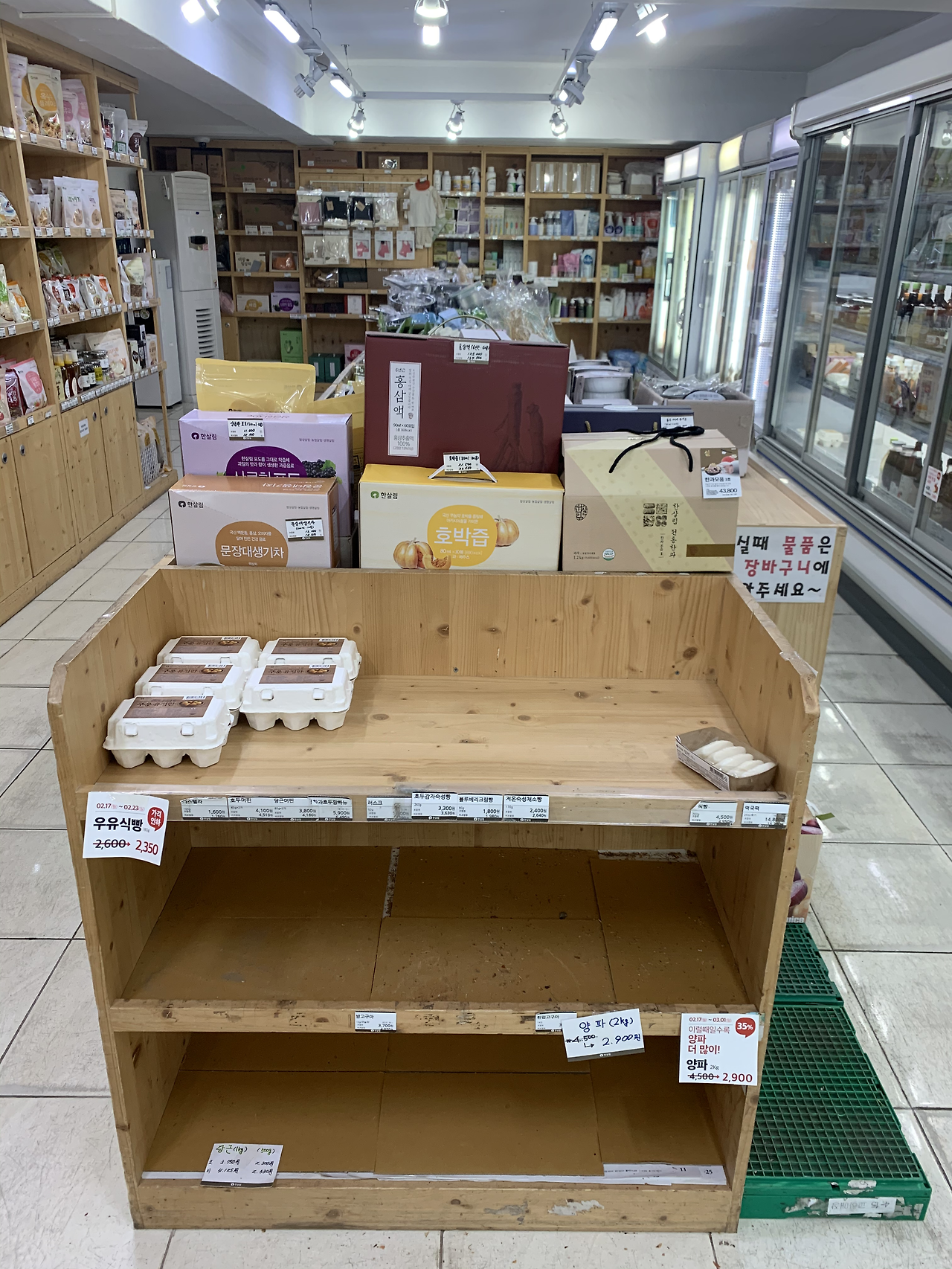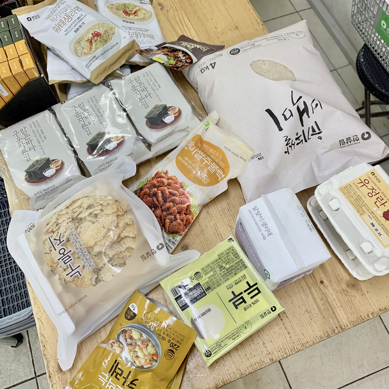 그가 올 금요일, 체력 보충도 할 겸 고기를 구워 먹기로 하고서 그가 오기 전 점심시간에 미리 재료를 사러 한살림에 갔다. 타지의 지인들이 이거 진짜냐며 대구 마트 사재기 사진을 보낼 때마다 "이정돈 아니야 에이" 했는데.. 매장에 들어서자마자 제일 먼저 보이는 텅텅 빈 신선코너. 내가 좋아하는 콩빵도, 우유도, 계란도, 과일이나 야채나 구황작물까지. 그 어느 것 하나 남아있지 않았다. 잘 아는 직원분이 절레절레하며 얘기하셨다. "명절 전날 같네요." 쌀과 두부, 김, 누룽지, 라면, 그리고 한우 등심이랑 생삼겹살을 사들고 나왔다. 사지 못한 쌈 야채는 내 작업실의 식물재배기에서 버터헤드를 따서 대신하고. 집에서 김치와 명이나물을 찬조받아서. 그리고 금요일 밤, 영덕에서 온 그와 예비신혼집에서 고기 파티를 벌였다.