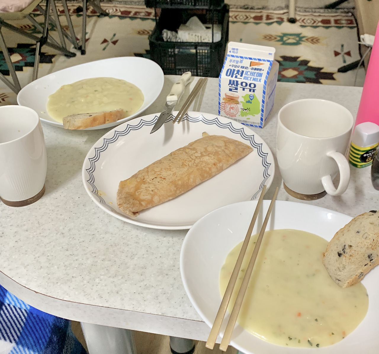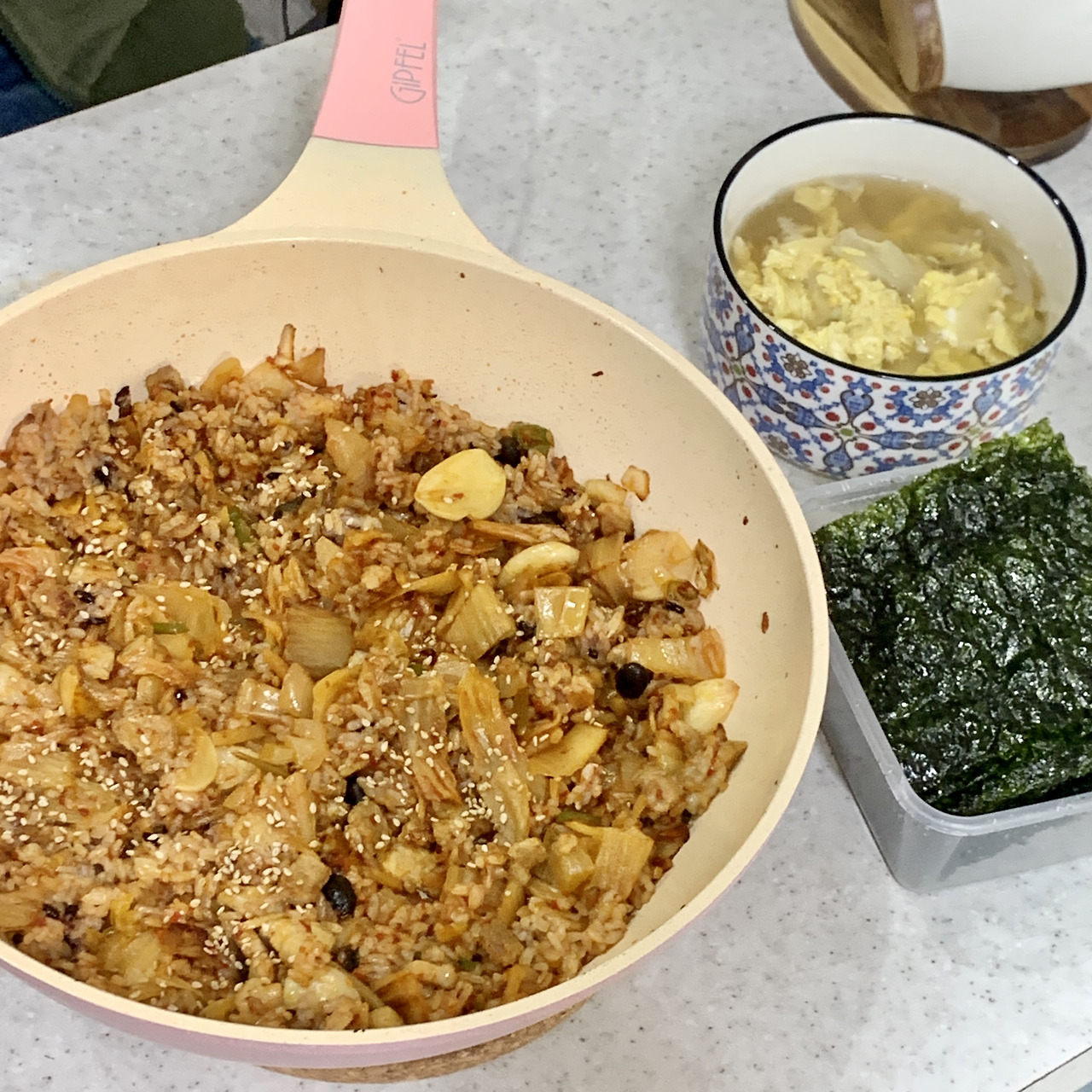 그의 차 토닉이에게 줄 워셔액을 사러 다이소를 들린 후, 나온 김에 차로 드라이브라도 하려 했는데 배가 고파진 우리는 집에 가서 밥을 먹고 다시 나오기로. 어제 남은 삼겹살로 그가 김치볶음밥과 계란국을 만들어 주었다.
