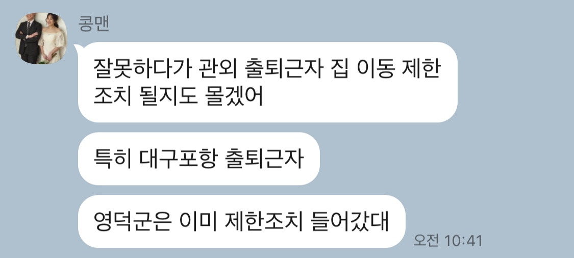 (금요일 당시엔) 대구에 100명 가량 집중되어있는 터라 오지 말라고, 아직까지 청정지역인 그의 동네에 있으라 했는데 그는 결국 대구행을 감행했다.