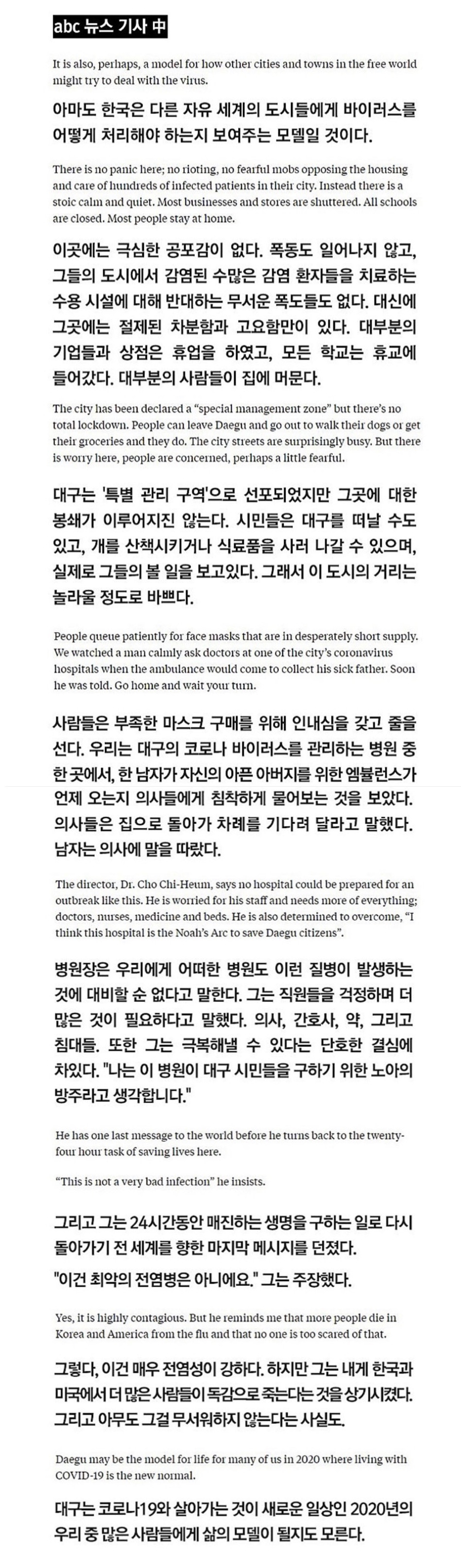 "한 병원에서 구급차가 언제쯤 아픈 아버지를 모시러 올 수 있느냐고 차분히 묻는 한 남성을 만났다. 그는 '집에 돌아가 순서를 기다려달라'는 말을 듣고 순순히 발길을 돌렸다. 대구에 공황은 없다. 폭동도 없고, 두려워하는 군중도 없다. 절제심 강한 침착함과 고요함만이 버티고 있을 뿐이다."