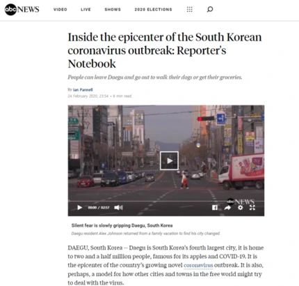 미국 ABC방송 이언 패널(Ian Pannell) 특파원이 코로나19를 극복하고자 힘든 싸움을 벌이고 있는 대구를 찾아 보도한 기사가 화제를 모으고 있다.