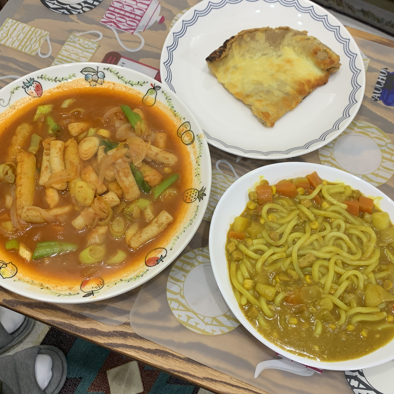 가족들과 함께 하려던 저녁메뉴가 수포로 돌아가고, 우리는 그냥 우리끼리 어제저녁으로 먹고 남은 카레를 먹기로 했다. 그는 떡볶이를, 나는 우동카레를 만들어. 지난주에 망쳐 냉동실에 얼려둔 감자 피자를 다시 에어프라이기로 회생해서 같이 먹었다.