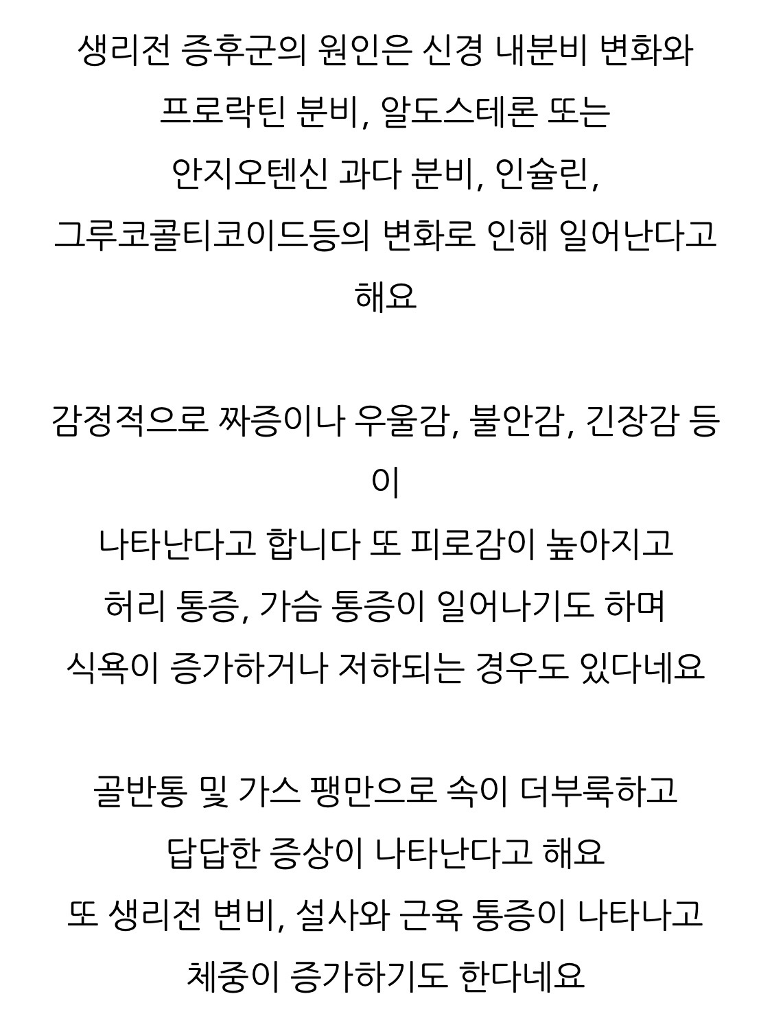 '생리전증후군은 보통 여성이 생리 전 1~2주 동안 경험하는 신체 및 심리적 증상을 말합니다.'라고 하는데 생리가 2~3주마다 반복되는 나는 한 달에 2주일은 생리전증후군을 겪고 1주일은 생리를 하면 나머지 무탈한 날은 겨우 일주일에서 열흘? 365일 중