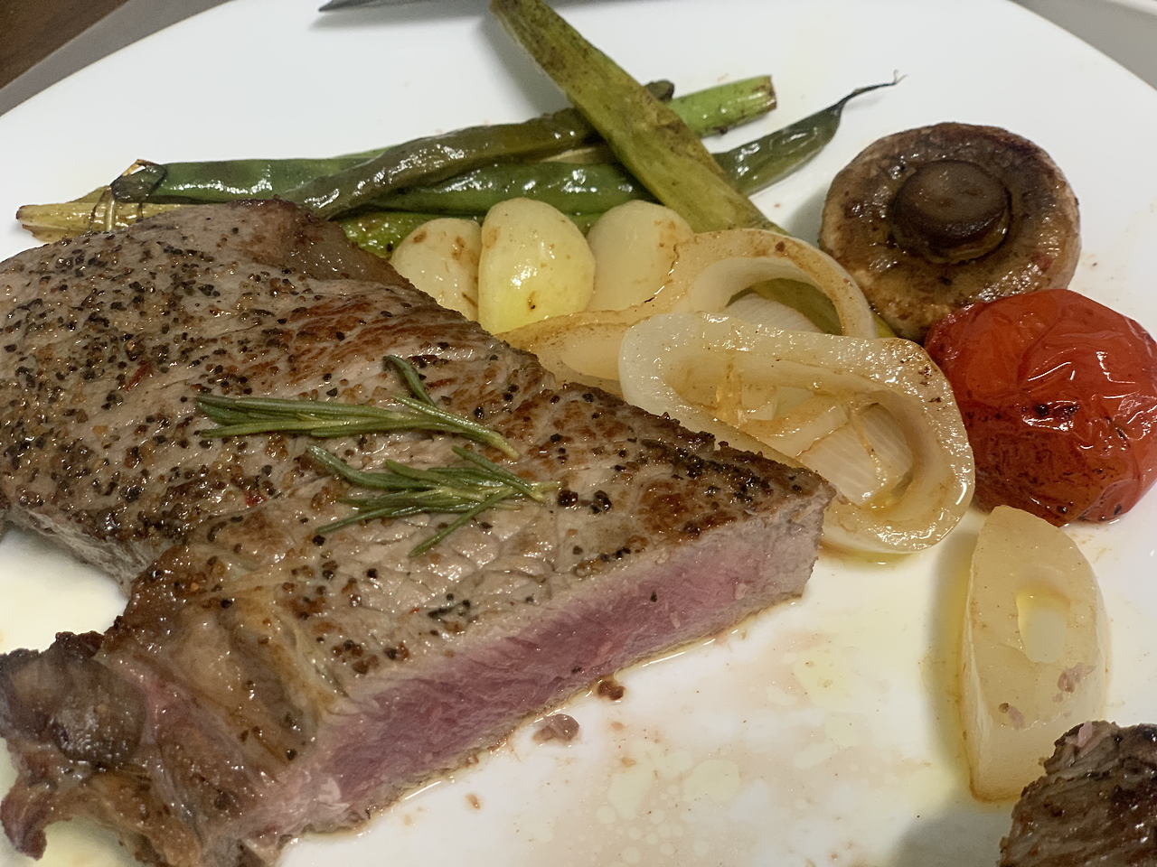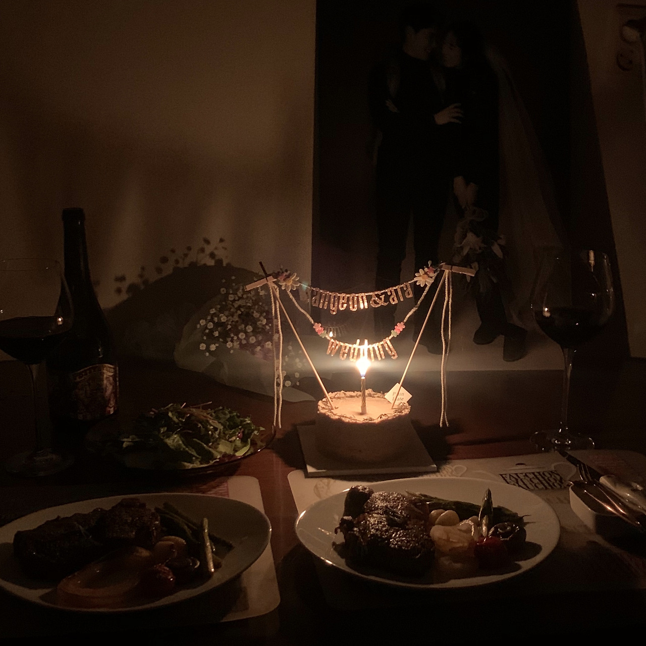2020년 4월 11일, 코로나가 아니었으면 결혼식을 올렸을 날. 그의 근무가 아니었으면 양가 부모님들과 함께 약혼식을 했을 오늘. 모두 실패로 돌아가 나는 울적했고. 그런데 웬일인지 그가 쿵짝을 맞춰주었다. "스테이크 구워 와인이랑 먹을까." 하면서. 영천에서 돌아가는 길에 스테이크를 샀고 엄마오빠가 찾아놔 준 비건케이크를 가지고 우리의 홈스윗홈으로. 그가 쉪을 나는 보조를 하면서 요리놀이를 했다. 그가 스테이크를 구우면 나는 옆에서 샐러드와 케이크 데코를 하는 식. 완성된 콩맨의 인생 첫 스테이크는 그야말로 "체고~!". 내가 좋아하는 미디움레어로 딱. 안전빵으로 다른 하나는 에어프라이어로 구웠는데 그가 직접 구워준 게 훨씬 더 맛있었다.