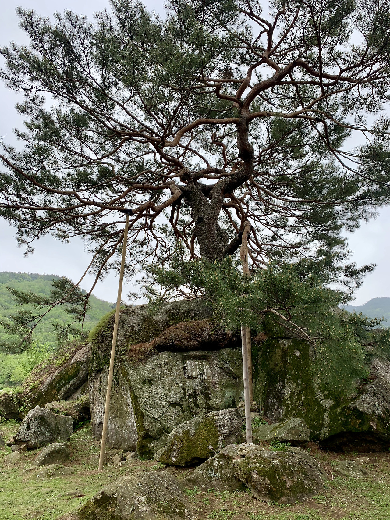 대축마을에 거의 이르러 만난 천연기념물 하동 축지리 문암송. 문암송은 문암, 곧 문바위 위에 난 소나무로 문바위에 떨어진 소나무 씨앗 하나가 바위 틈으로 조심스럽게 발을 뻗어 뿌리를 내렸고, 수백년 풍상을 겪어 마침내 앞에서 보면 바위에 걸텨 앉은 모양의 기괴한 소나무로 자랐다. 나이는 600살로 추정된다고. 마치 라임오렌지나무처럼 동네 가까이 있으면 매일매일 찾아와 안부도 묻고, 아지트로 삼고 싶은 그런 곳이었다. 그리고 마지막 1km를 걸어 마침내 우린 12코스의 종점, 대축마을에 도착했다. 만세!