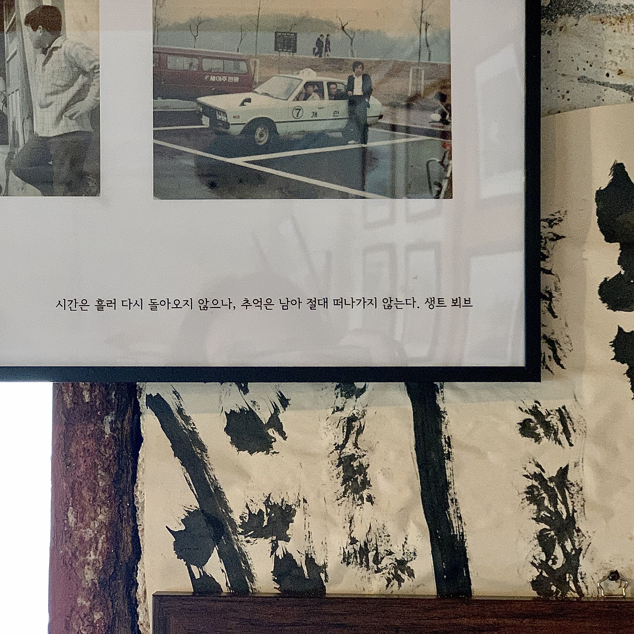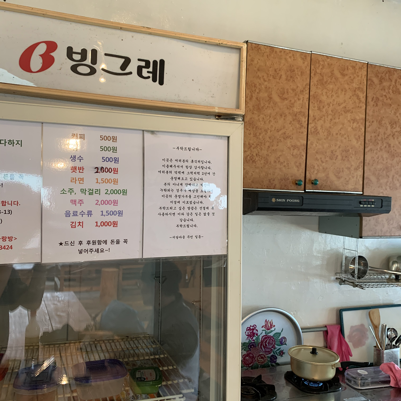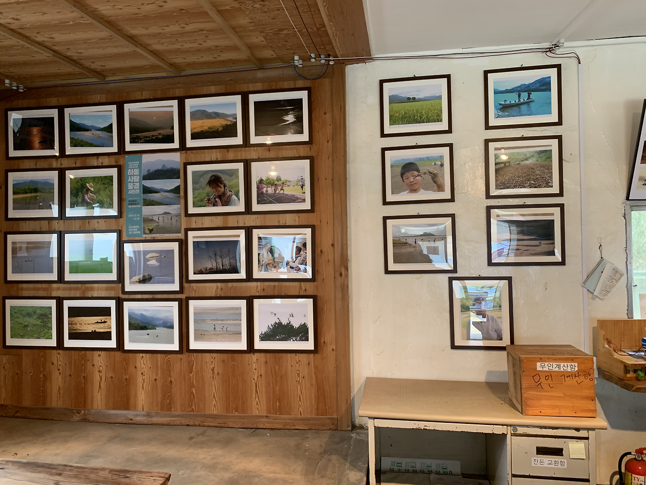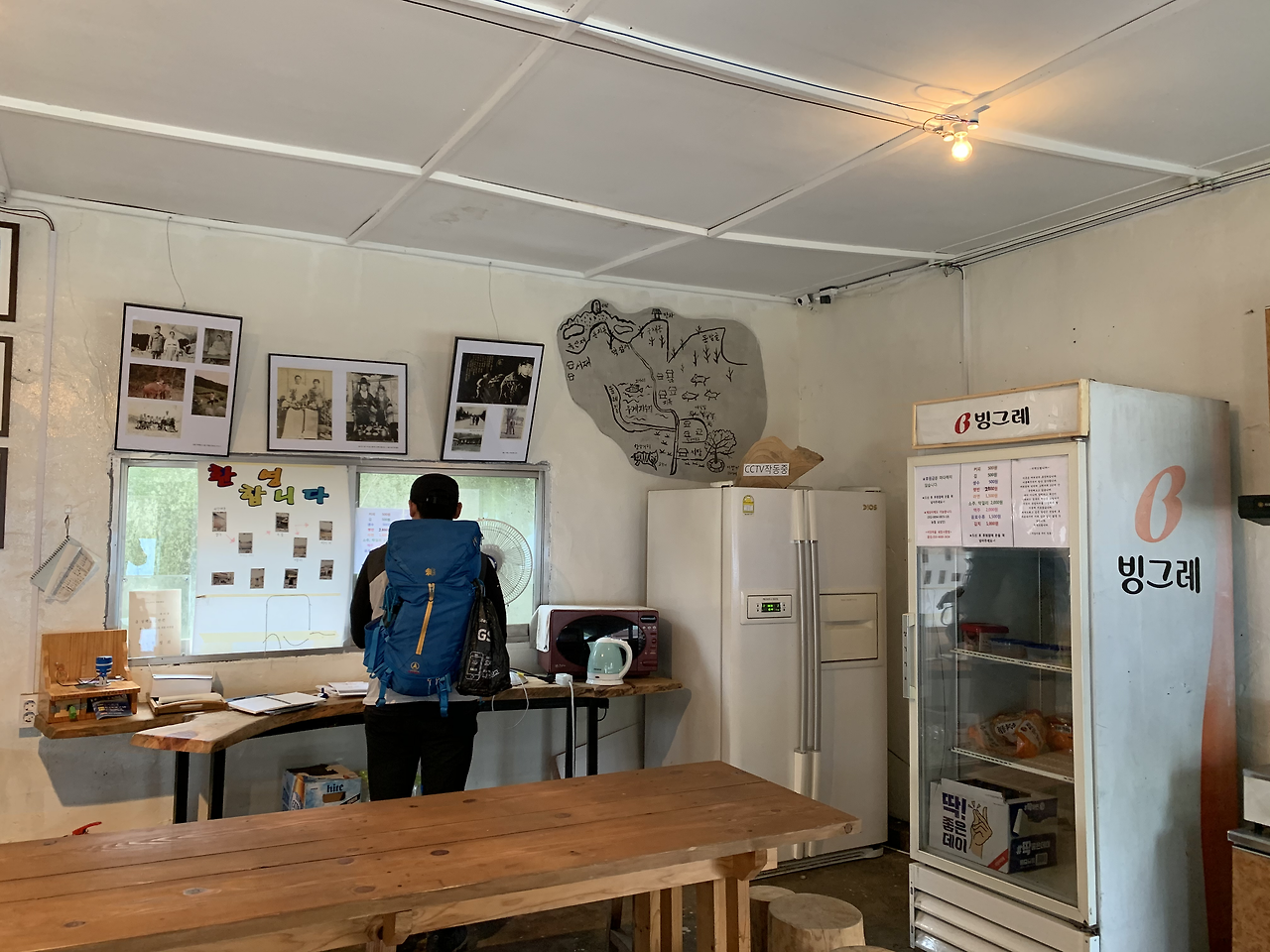 고개 하나를 넘으니 또 다른 마을을 만난다. 그가 작년의 둘레길 트레킹에서 산 하나를 넘을때마다 지역을 넘나드는 기분이 짜릿하다고 했는데 그 기분을 살짝 공감할 수 있었다. 물론 오늘은 지역이 바뀌는 코스는 아니지만. 한시간 정도 걸었을까, 무인가게 하나가 나왔다. 막걸리를 판다고 적혀있어 호기심에 들어간 그곳이 이번 여정의 가장 기억에 남는 공간, 가장 좋았던 순간이 될 줄은. 그곳은 전시갤러리이기도, 마을사랑방이기도, 매점이기도, 공용 주방이기도 했다. 아주 오래된 냉장고 안에는 안성탕면과 비어있지만 김치통, 그리고 골드빛 패키지가 매력적인 하동막걸리가 들어있었다. 아침을 든든히 먹은터라 배는 고프지 않았지만 이곳에서는 뭐라도 먹지 않으면 안될 것 같아 우리는 라면 한봉을 끓여 막걸리를 먹기로 했다.