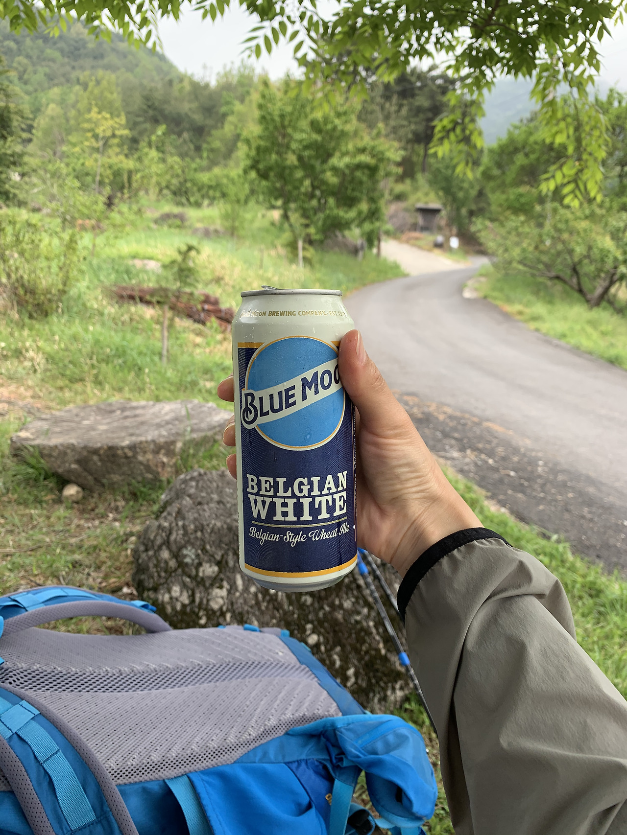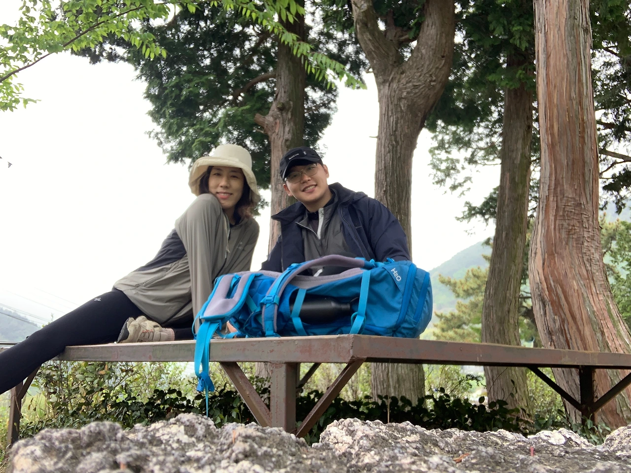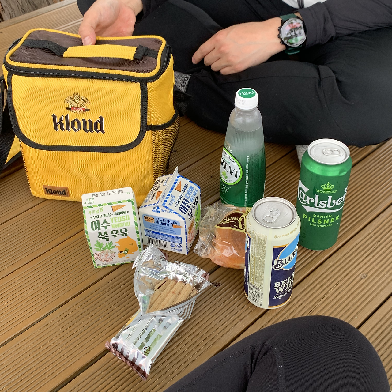 한참 고개를 오르락 내리락 한 후에 원래 오르려고 했던 구재봉 등산 입구를 만났다. 그런데 오늘 시야가 너무 좋지 않아 그가 오르지 말자고 했다. 거북이 모양의 정상비를 만나지 못하게 되었다는 아쉬움과 함께 왕복 4km 구간이 줄었음에 다행이란 생각이 들었다. 다음엔 날 좋은 날 꼭 올라야지. 그 후로도 몇 번의 고개를 넘었다. 갑자기 기온이 오르며 나른해지는 찰나 평상을 만나 쉬어가기로 한 우리. 동네과자점에서 산 햄버거빵과 함께 그는 대구에서부터 나 몰래 가져온 비밀의 음료를 의기양양해하며 꺼냈다.