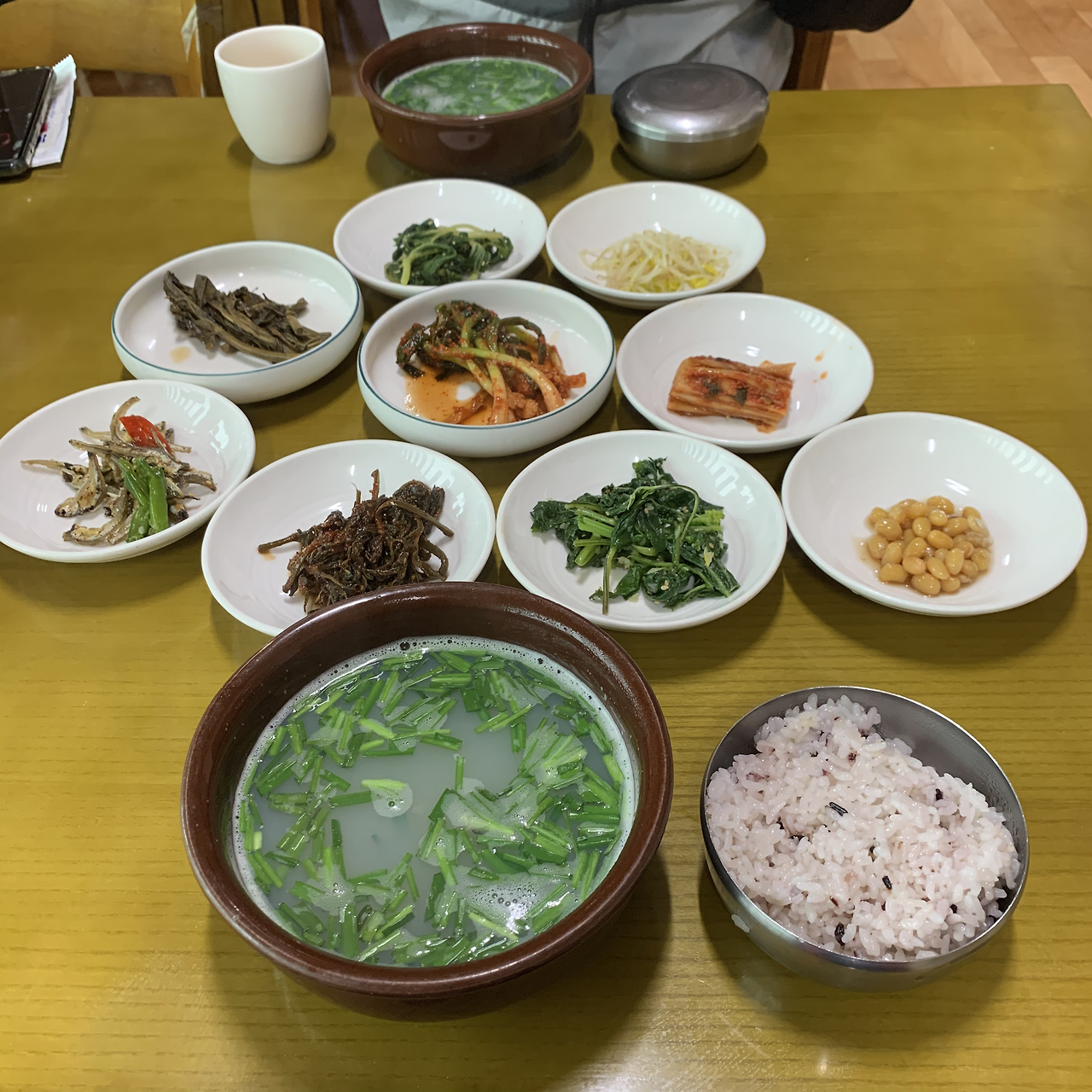 7시 반, 8시 50분에 버스를 탈거라 그 전에 꼭 아침식사를 해야만 한다. 마침 그가 찾아봤던 맛집 문이 열려있었다. 섬진강이 바라보이는 원조할매재첩식당. 큰 자막으로 뉴스를 보며 공기밥을 푸고 계시던 할머니가 내어주신 정식. 쌉싸름하고 깊은 재첩국으로 든든하게 배를 채웠다.