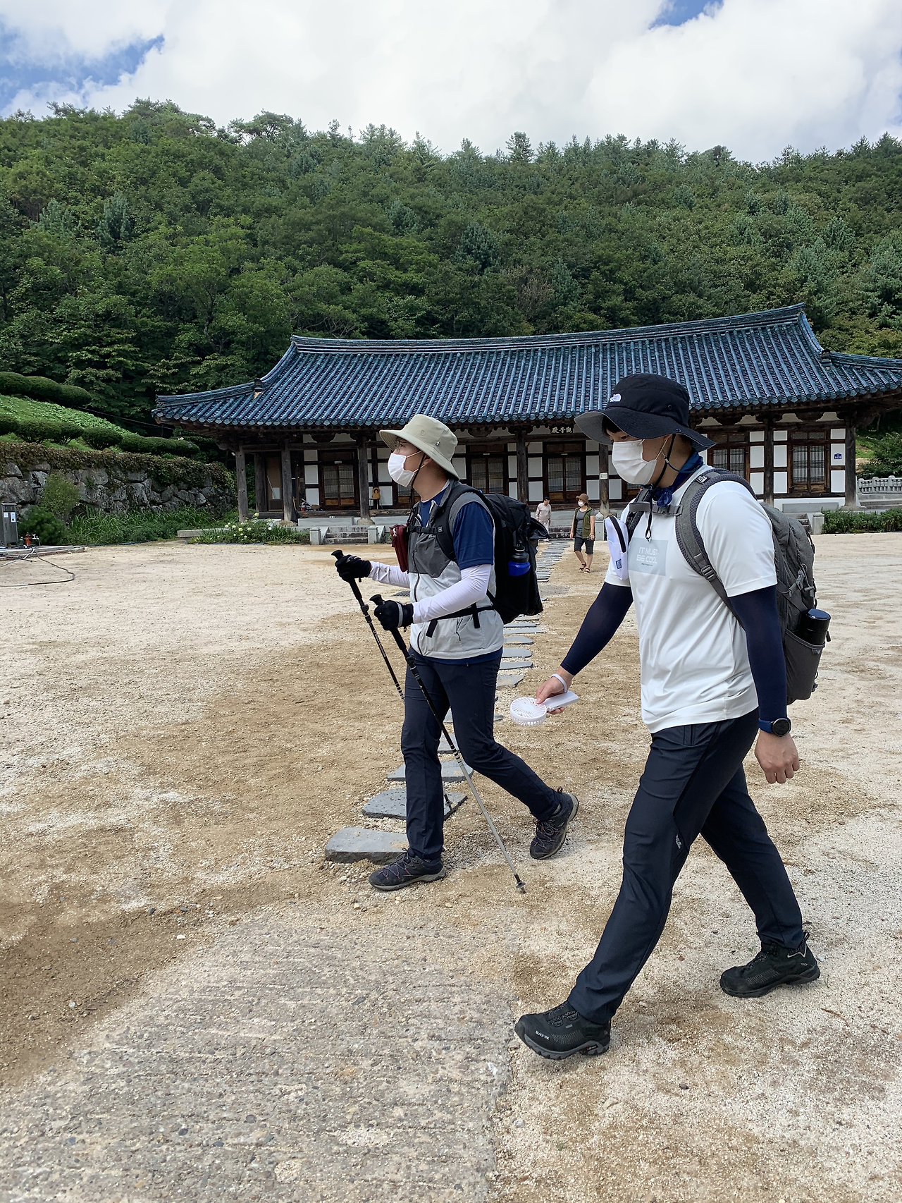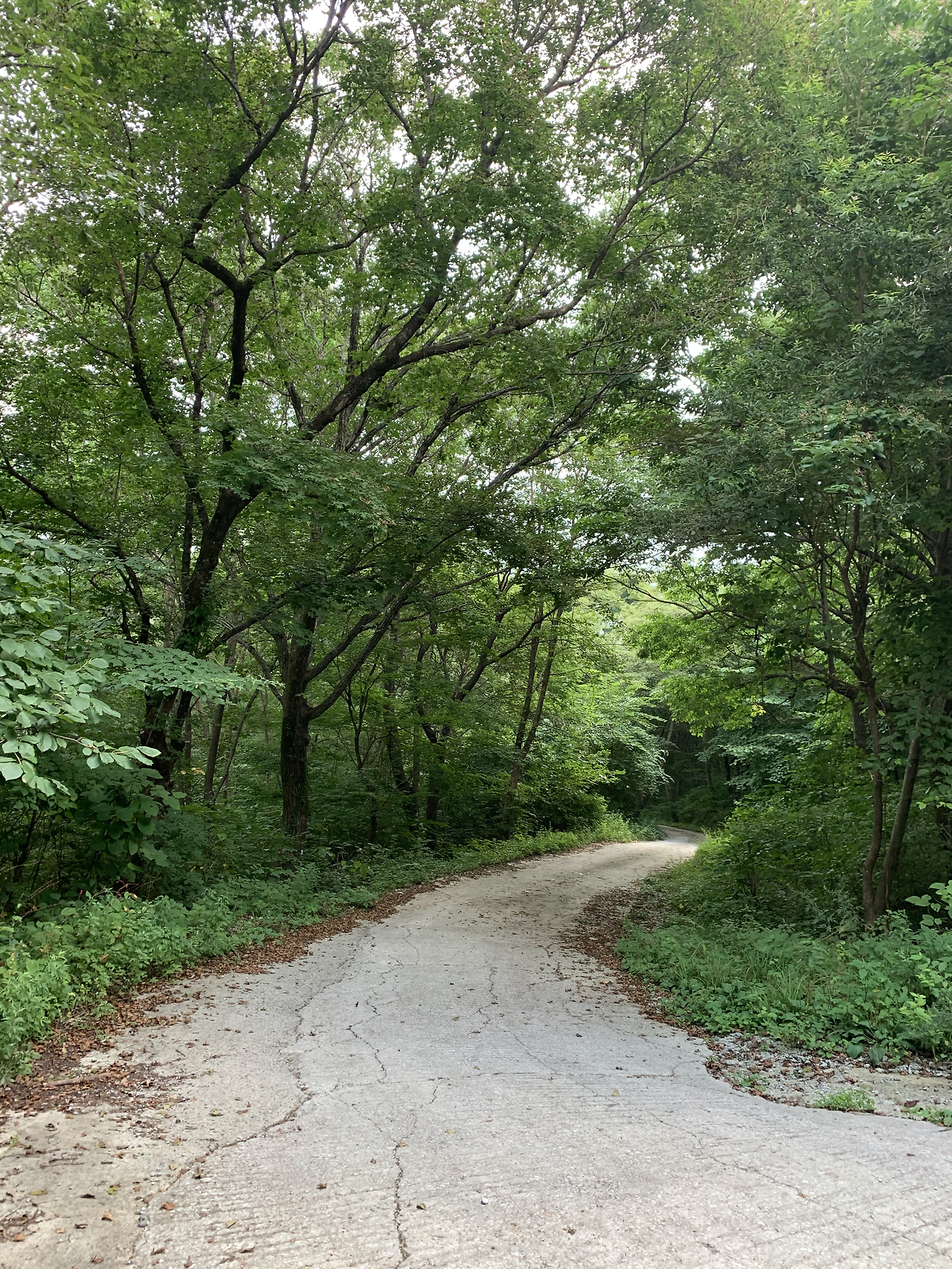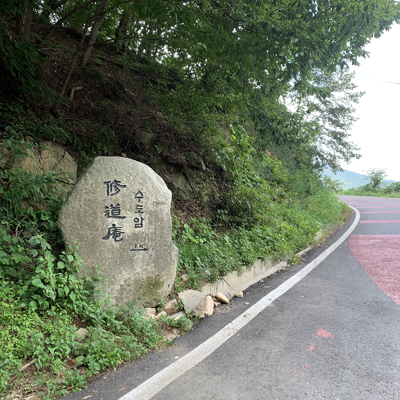 거의 마을로 다 내려왔다는 뜻. 산림청에서는 임도에 포장을 하면 흙 유실이 덜 되고 산사태를 예방할 수 있다고 좋아하는데, 환경부에서는 생태계가 훼손된다고 반대한다는 산림맨의 설명을 들으며 치유의 숲까지 내려왔다. 이제 우리의 원점 회귀지인 수도암까지는 1km 남은. 하산은 다 했는데 다시 가파른 오르막길로만 이루어진 1킬로. 좀 더 힘을 내보자 무브무브. 내려오면서 앞으로의 함양집 이야기도, 설이와 나의 비슷한 점 이야기를 했다. 설이는 태관이한테, 나는 콩맨한테 각자 거의 똑같은 이야기를 했다는 신기한 일도. 확실히 코드가 잘맞고 편한 두사람이여.