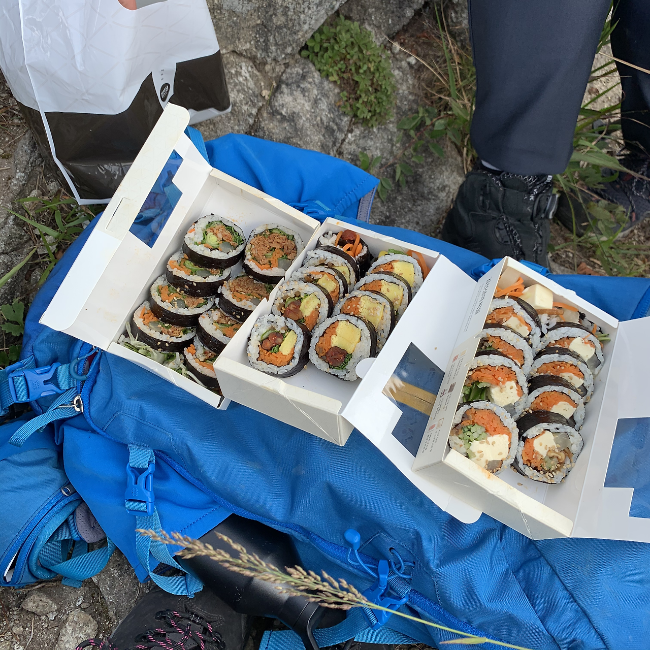 정상에 올라 점심으로 먹을 김밥 세줄과 함께