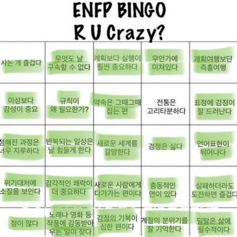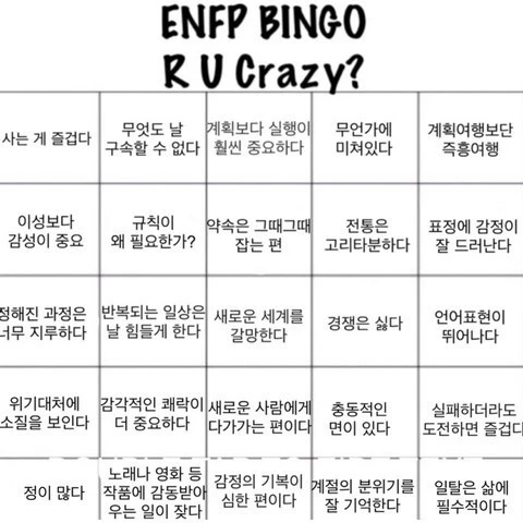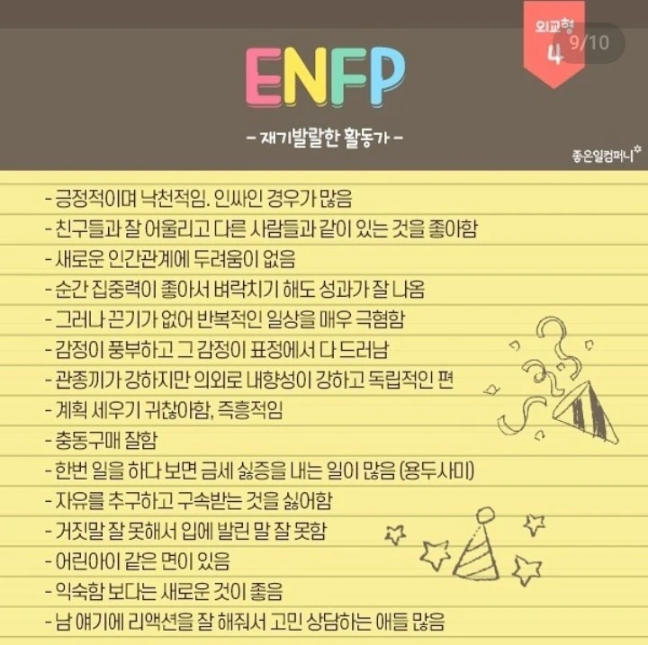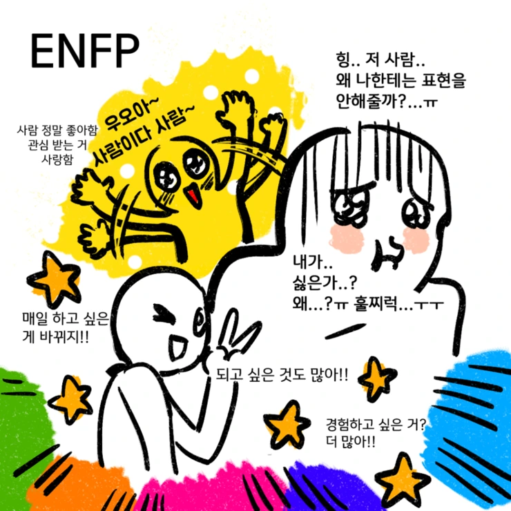 • 같은 ENFP끼리 서로 동질감은 느끼지만 같이 붙어있기는 시끄럽다고 싫다고 한다
