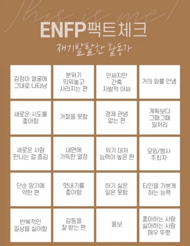 물론 16가지 유형으로 사람을 분류하는 것엔 오류가 존재한다. ENFP 하나로 나라는 사람을 온전히 표현할 수는 없다. 결론은 어쨌든 인생은 나를 알아가는 과정이라는 거다.