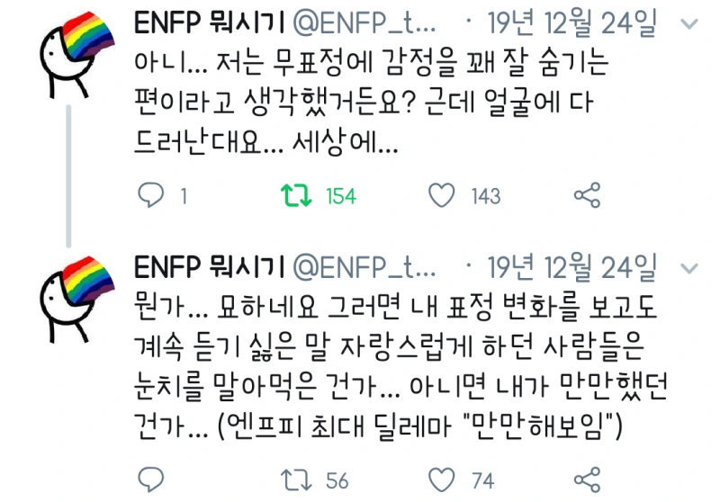 • 이 귀여운 감초 역할의 엔프피를 보고 사람들은 그를 절친으로 여기며 편해하는데, 정작 엔프피는 내가 언제 그들의 절친이 된 건지 의아해함 (엔프피둥절)