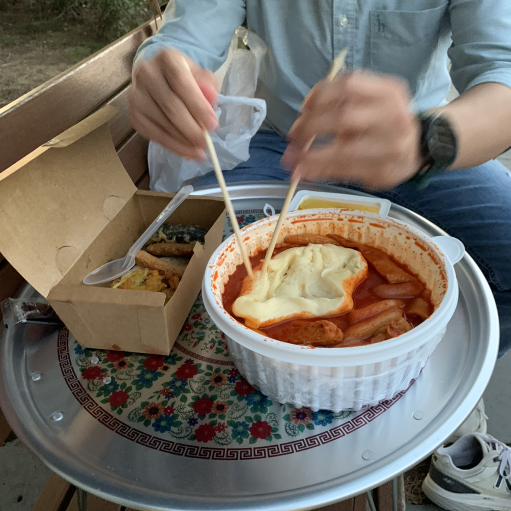 마침내 떡볶이는 왔고 우리는 오봉테이블을 꺼내 만찬을 즐겼다. 생각했던 캠핑 느낌과는 거리가 멀었지만 이런들 저런들 어떠하랴. 다 먹고서 소화시킬 겸 두 손 맞잡고 걸은 해맞이동산부터 금호강변 밤산책이 참으로 좋았다. 이렇게 낮시간은 도심 데이트를, 늦은 오후 시간은 대구를 벗어나 시골여행을 한 것만 같은 일명 '동구밖여행' 하루가 이렇게 저물어갔다.