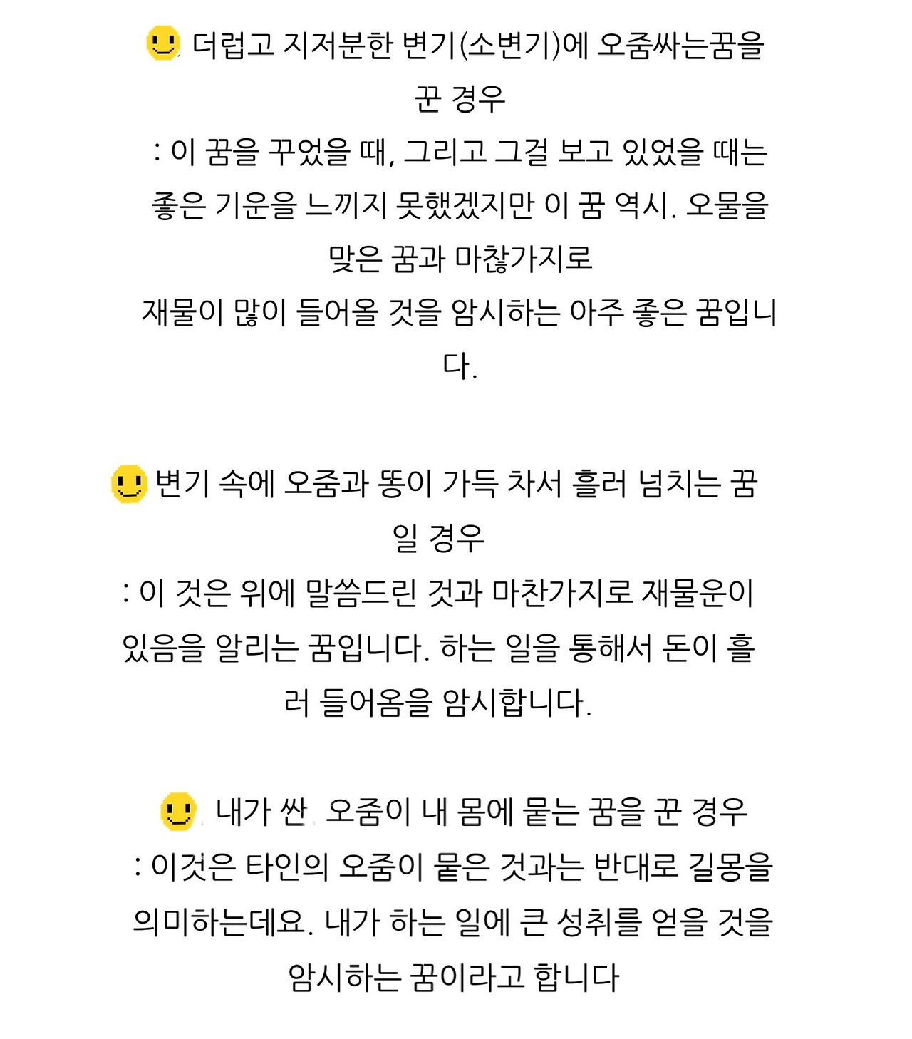 화장실 바닥에 흥건히 고이고 것도 모자라 옷에도 다 묻었다. 너무 리얼해서 꿈속에서 나도 모르게 '아씨 큰일 났다.' 식은땀을 흘렸다. 잠에서 깨자 말자 잠옷 바지부터 확인했다. 당연히 궁금해지는 해몽. 어렵지 않게 찾을 수 있었다.