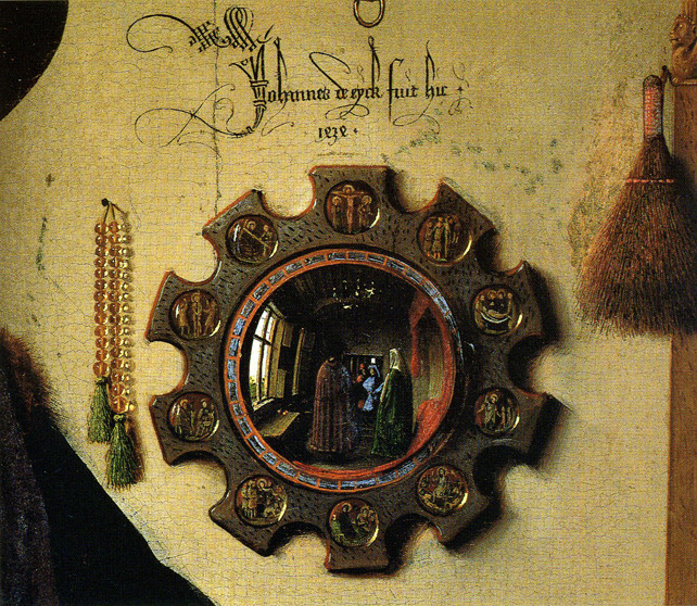 아래 그림 '얀 반 에이크'의 '아르놀피니 부부의 초상'을 보더라도 결혼 생활이 고난의 연속임을 알 수 있다. 상징들로 가득한 이 그림은 곳곳에 결혼을 의미하는 이미지들이 그려져 있는데, 부부가 되는 두 사람의 뒷 배경 중 볼록 거울을 보자.