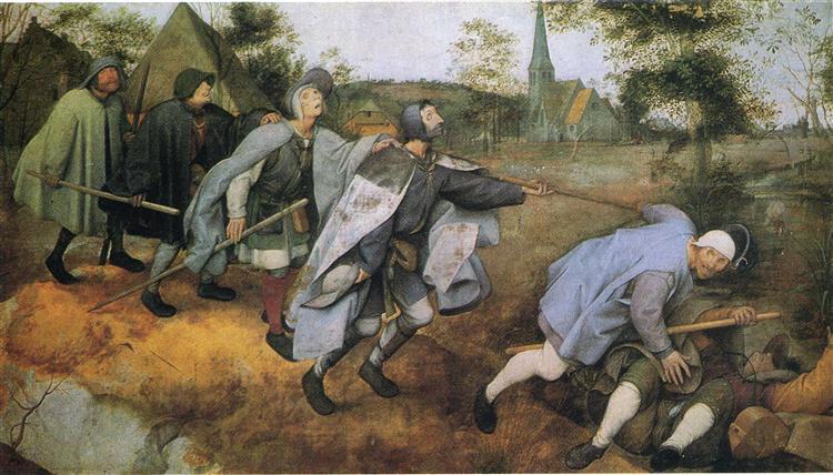 맹인이 맹인을 인도한다는 피터 브뤼겔의 작품에 영향을 받았습니다. 1568년의 작품으로, 막대기와 서로의 어깨를 의지하며 길게 줄을 서서 걸어가는 모습을 볼 수 있습니다. 맨 앞에서 그들을 이끌었던 시각장애인은 구덩이에 빠져있습니다.