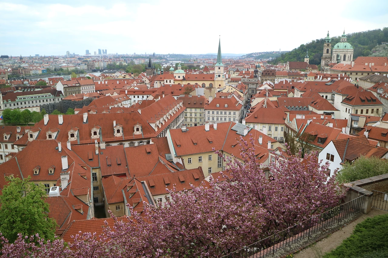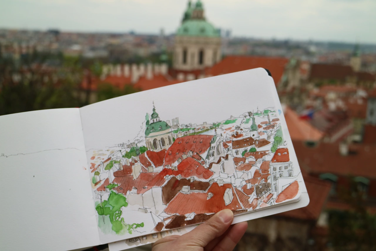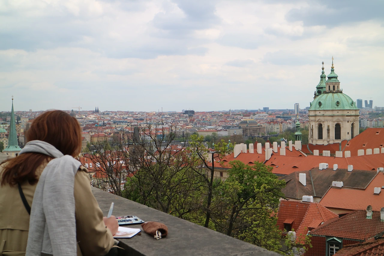 다음날 아침 하늘은 흐렸고, 나는 쓸쓸한 마음으로 눈을 떴다. 이렇게 하루를 날려버릴 수 없다, 뭐라도 해야 한다는 심정으로 그림도구를 챙겨 버스를 타고 다시 프라하 성으로 올랐다. 발드슈테윤스카 정원 Wallenstein Garden에서 프라하성으로 걸어가는 동안 차츰 구름이 걷히기 시작했다. 성벽에 서서 구시가지를 바라보았다. 햇빛이 들어오자 주황색의 지붕들과 에메랄드빛 첨탑이 선명해지면서 멋진 풍경이 펼쳐졌다.