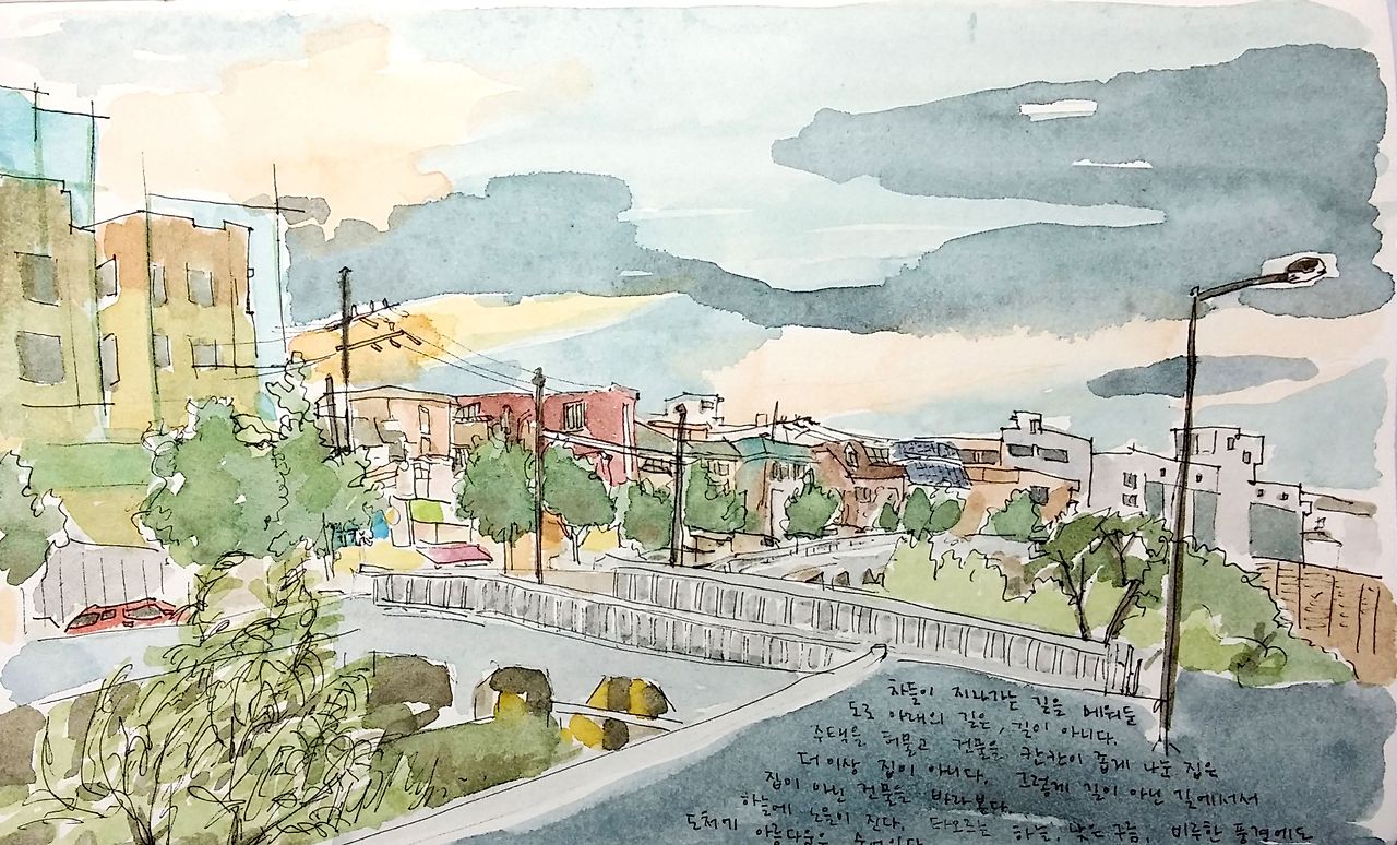 길이 아닌 길을 걸으며 집이 아닌 집을 바라보다가, 문득 빛나는 노을이 눈에 들어온다.