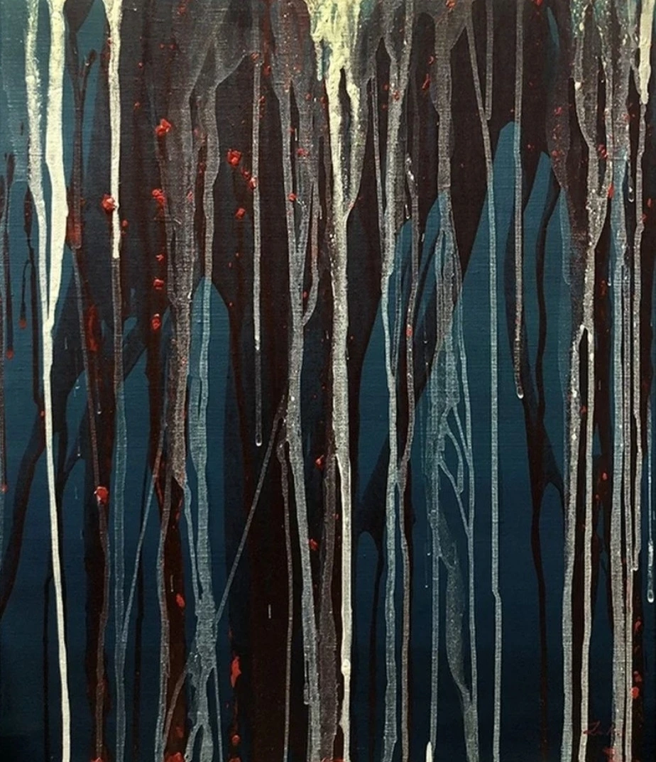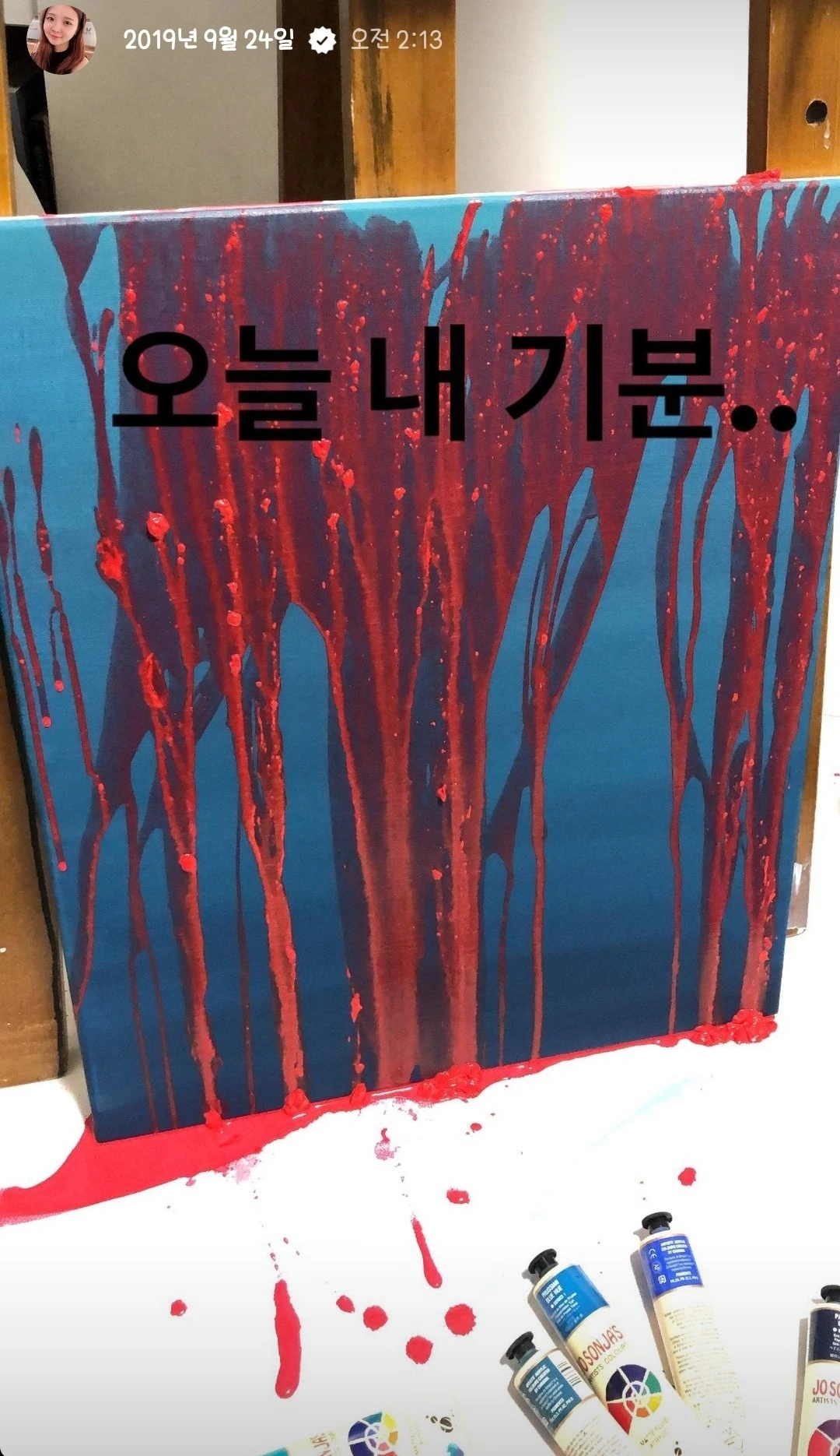 아래 사진은 우울했던 2019년 9월 24일 새벽 2시 인스타 스토리 기록과 완성된 그림. 다시 보니까 그날은 내 마음이 어마어마하게 아팠나 보다. 리얼하게 피의 느낌을 내고 싶어서 그냥 빨강이 아닌 피와 비슷한 색으로 만들고 피의 덩어리 진 느낌까지 생각해서 물감에 일부러 덩어리가 남도록 물감을 덜 풀어서 피가 흐르듯 부어서 흐르게 했던 작업. 그러고서 잠들었는데 아침에 일어나니까 기분이 나아져서 깨끗한 흰색을 부어서 흐르게 했다. 그래서 제목은 '고통과 치유의 반복'.