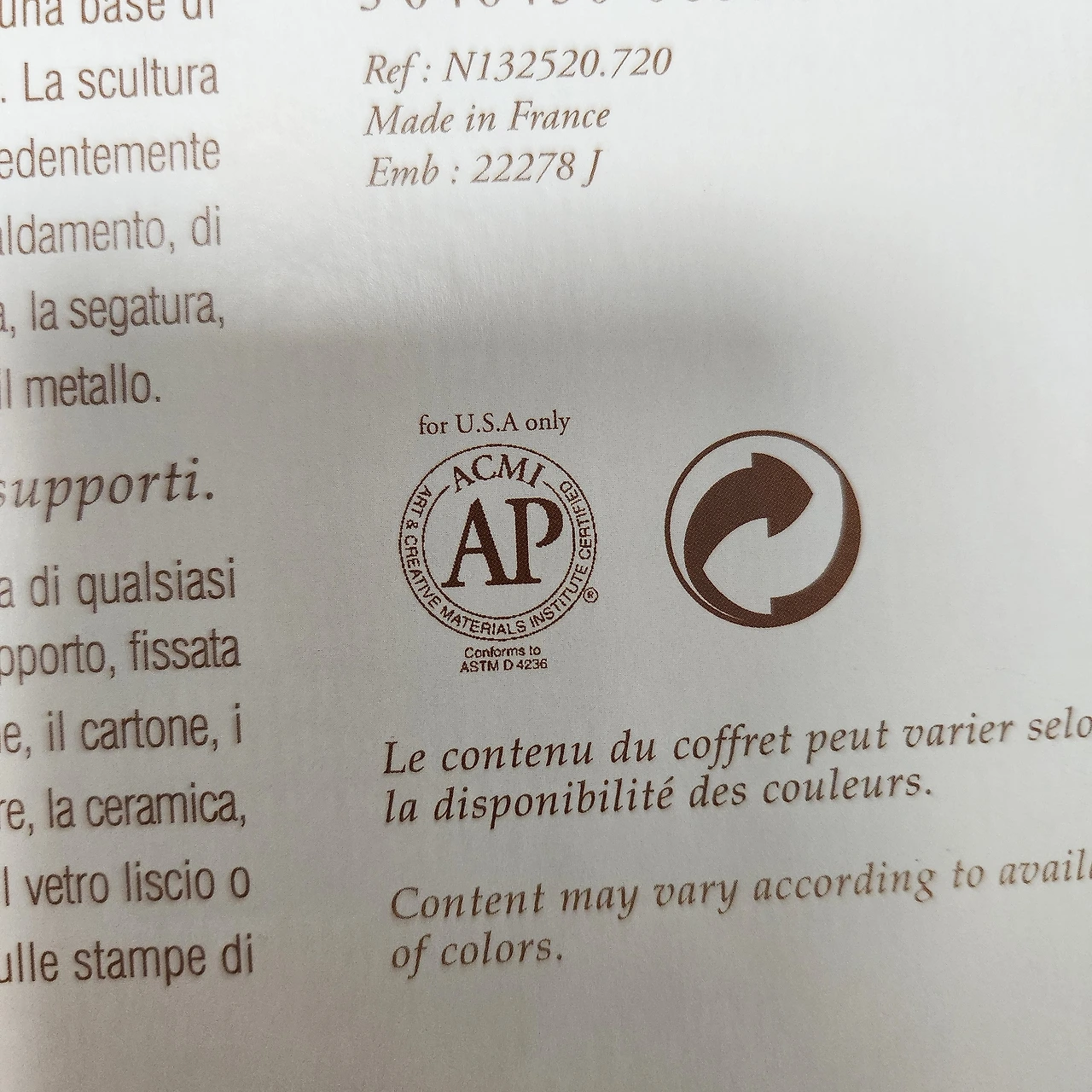 그러다 보니 미술재료의 안전성을 검증하기 위해 ACMI라는 단체가 생기게 되었고 우리는 재료에 표기된 마크를 보고 재료의 안전성을 구분할 수 있다. 미술재료를 보면 AP 같은 마크를 볼 수 있는데 AP는 ACMI에서 무독성테스트를 통과한 인증마크다. CL은 인체 유해 물질이 기준치 이상이지만 그럼에도 안전성은 충족할 때 붙여지는 마크다. 성인은 괜찮지만 아동은 주의가 필요하다.