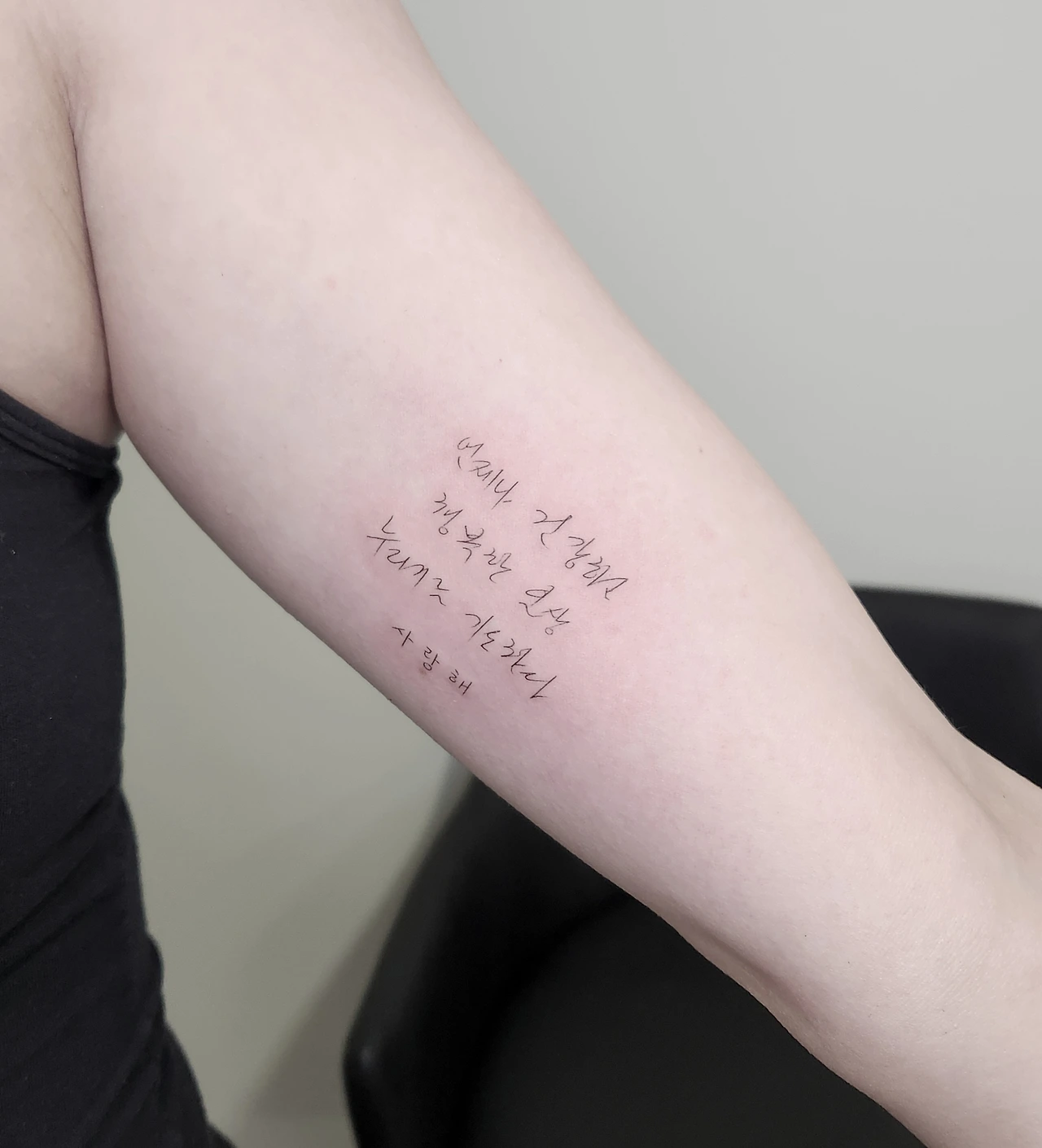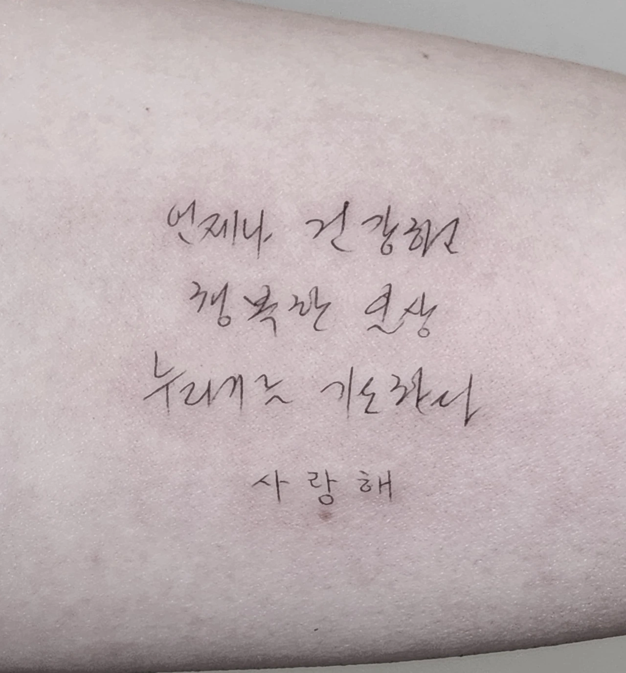 그런데 이제 벌써 70대가 다가오는 부모님을 생각하니까 문득 이런 생각이 들었다. 나중에 언젠가 세상에 안 계시는 날이 오면 그땐 편지를 더 이상 받지 못한다는 생각. 상상만으로도 슬프다. 그래서 갖고 싶었다. 그냥 나만 보려고 내 눈에 잘 보이는 부위에 했다. 서있거나 얼핏 보면 보이지 않는 남들 눈에는 잘 안 보이는 팔 안쪽에 엄마, 아빠의 글씨를 넣었다.