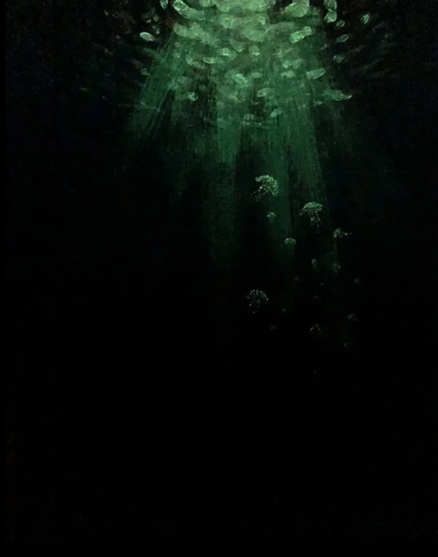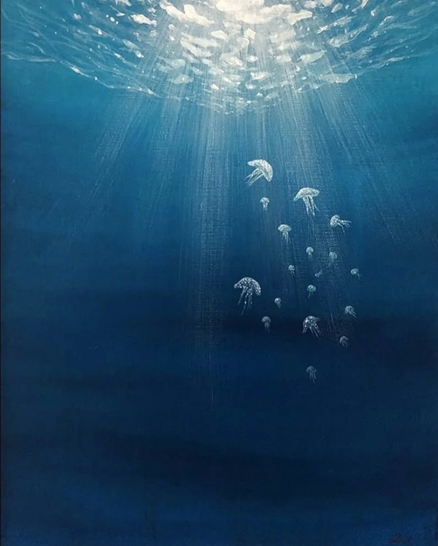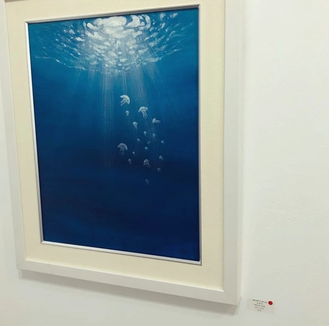 이 그림은 그 바닷속, 아주 고요한 날에 태어났다. 말하지 못한 감정들이 해파리의 모습으로 떠오르는 장면을 그렸다. 해파리는 부드럽게 흐르지만 그 움직임엔 슬픔이 깃들어 있다. 너무 약해서 붙잡을 수 없고 너무 맑아서 오래 볼 수도 없다. 한편으로는 Jelly fish라는 그 이름이 재미있기도 하다. 젤리의 촉감이 생각나는 이름이다. 나는 그들을 바라보며, 내 안의 오래된 기억과 마주했다. 빛은 위에서 쏟아졌지만 그건 치유가 아니라 드러냄이었다. 투명함 속에 존재하는 더 투명한 것들을 조용히 떠오르게 하는 빛. 해파리들은 빛에 닿아 더욱 선명해진다. 오래된 추억 또는 감정들이 모습을 드러내는 것처럼.