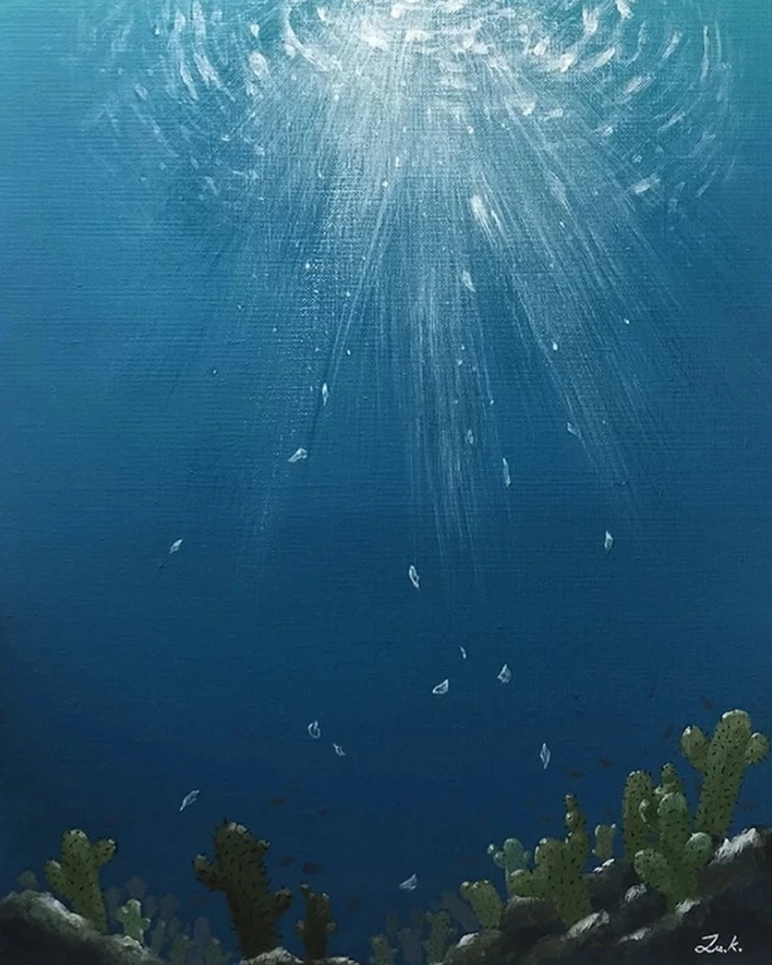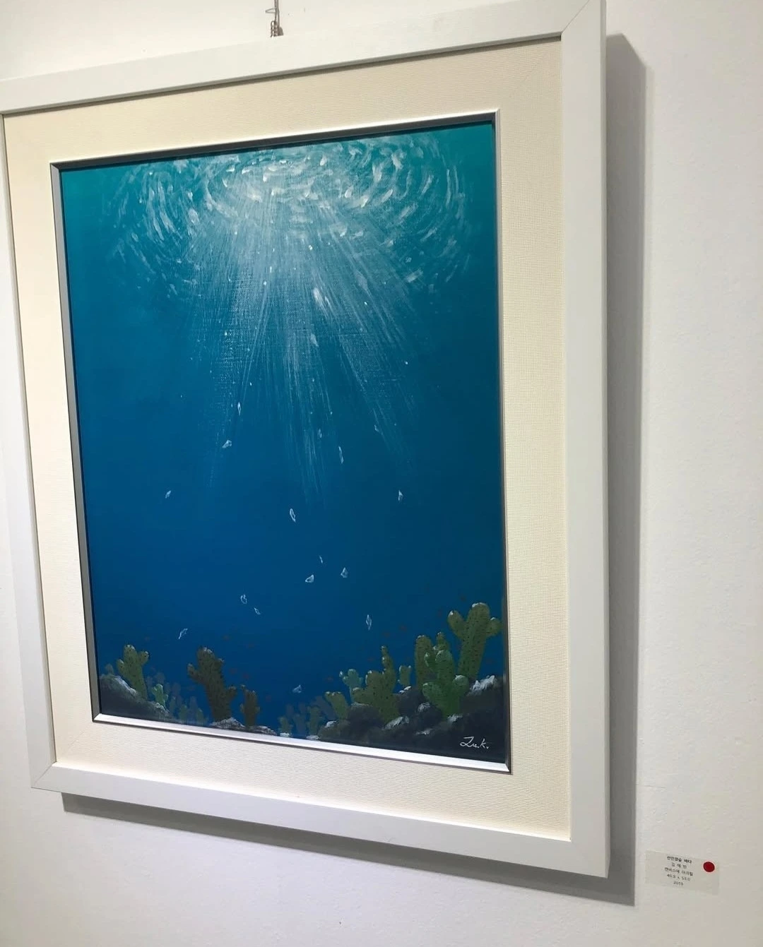 바다에는 형형색색 알록달록한 산호들이 가득하지만 나의 바다에는 푸른 선인장숲이 가득하다. 선인장 주변을 맴도는 물고기들은 사람처럼 맴돌 뿐 다가오지 못한다. 방어기제로 가시를 세운 선인장 주변의 물고기들은 나름대로 기대어보려 하지만 선인장의 가시는 물고기들을 허락하지 않는다. 희망이 가득한 빛줄기에서 유리조각들이 흘러내린다. 날카로운 유리조각에 베어 상처가 날 수도 있지만, 그럼에도 불구하고 선인장들의 시선은 물 밖의 세상을 갈구하며 빛을 향한다.