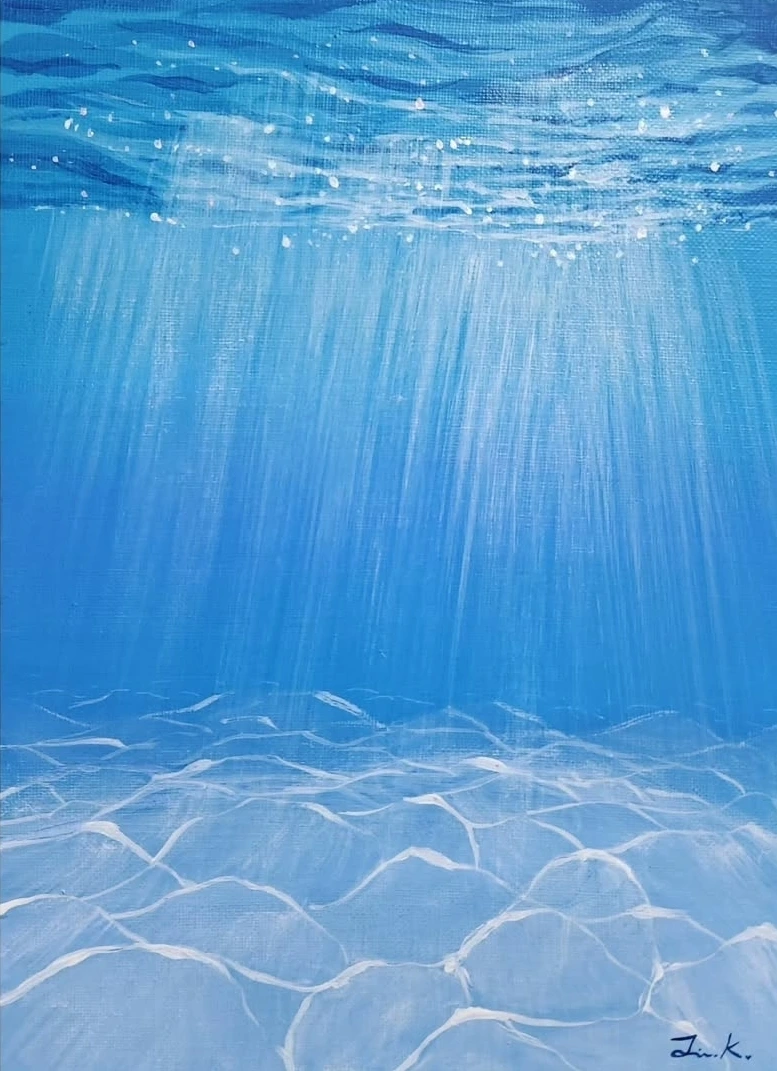 예전에 바닷속 물결의 일렁임을 유심히 바라본 적이 있다. 그 장면이 기억에 또렷이 남아 이번 작업에도 담겼다. 바다가 숨을 쉬는 것 같은, 고요한 숨결 같은 물결. 깊숙이 바닥에 닿은 빛이 바다의 호흡처럼 잔잔히 퍼진다. 심장이 뛰는 것처럼 빛과 바다의 숨결이 하나 되어 일렁일 때, 바다가 살아 있다는 것을 느낀다.
