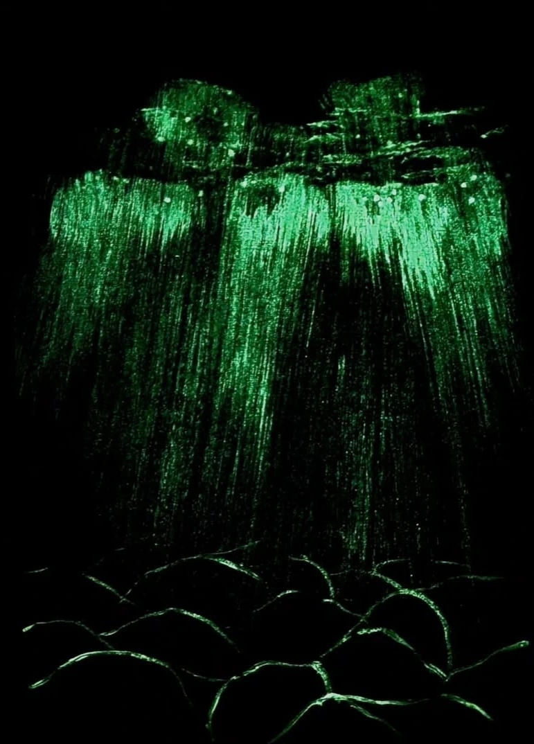 바다는 그 자체가 생명이며, 생명을 잉태하는 양수를 품고 있는 거대한 자궁이기도 하다. 그 안에는 창조와 정화, 치유와 흐름이 공존한다. 때로는 따뜻하고 평온하게, 때로는 무섭게 잠잠해지기도 한다. 바다는 자비롭지만 동시에 엄하게 다그치기도 한다. 나는 그 이중성을 낮과 밤으로 나누어 표현했다. 낮의 바다는 그 자체로 평화롭고 맑으며 따뜻하다. 반면 어둠 속, 야광빛이 드러낸 밤의 바다는 강렬하고 날카롭다. 공존하는 빛과 어둠, 숨결과 정적, 자비와 엄함, 그 모든 것은 살아 숨 쉬고 있는 바다 그 자체다.