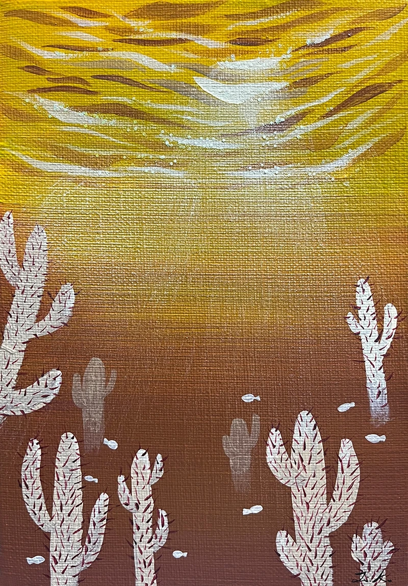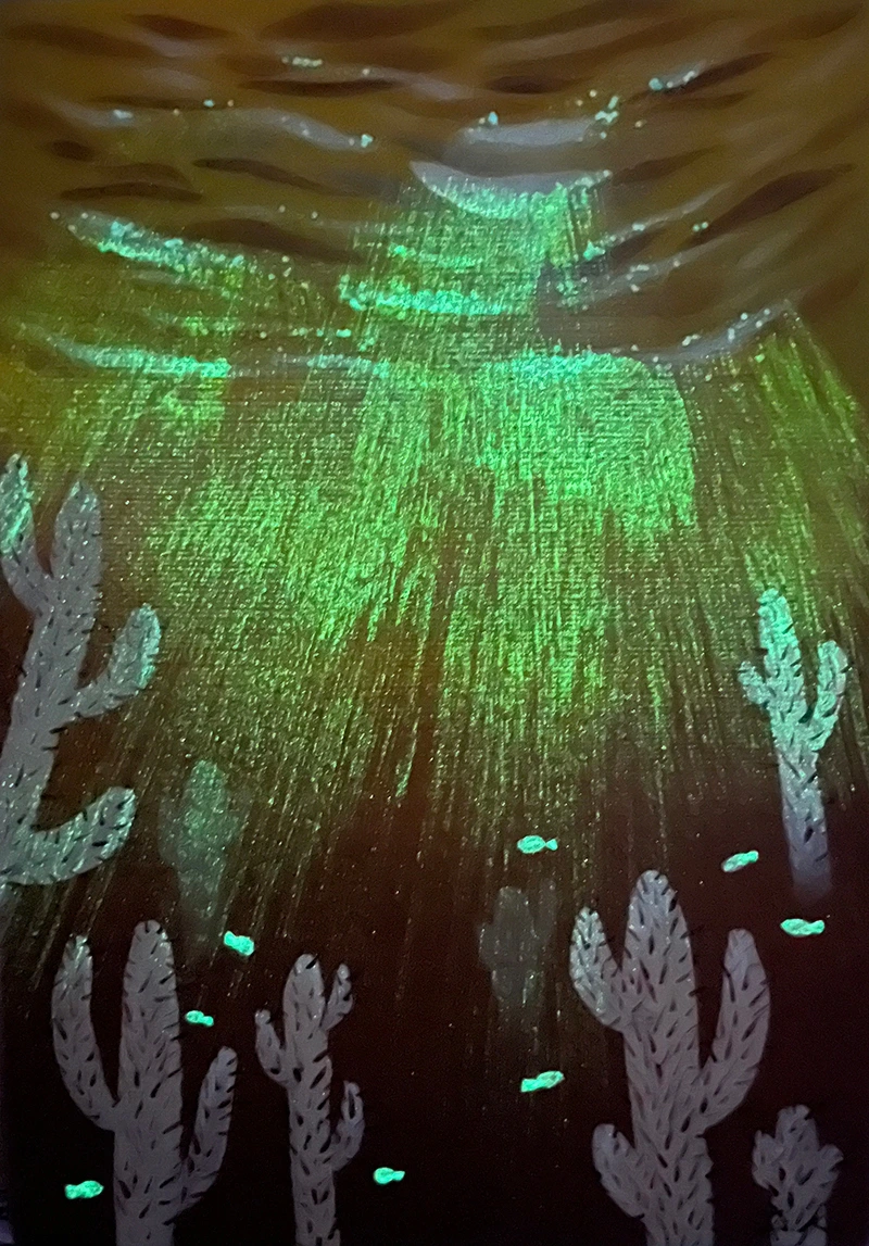 가시를 품은 선인장은 상처받지 않기 위해 스스로를 무장한 존재다. 바닷속 깊은 곳, 말라버린 감정의 무덤 위에 선인장들이 묘비처럼 서 있다. 이 그림은 고요한 심연 속에서 소리치는 들리지 않는 비명(悲鳴)과, 운명처럼 주어진 슬픔을 이야기한다. 그래서 비명(슬플 비悲, 목숨 명命)이란 제목처럼 슬픈 운명(命)을 지닌다.