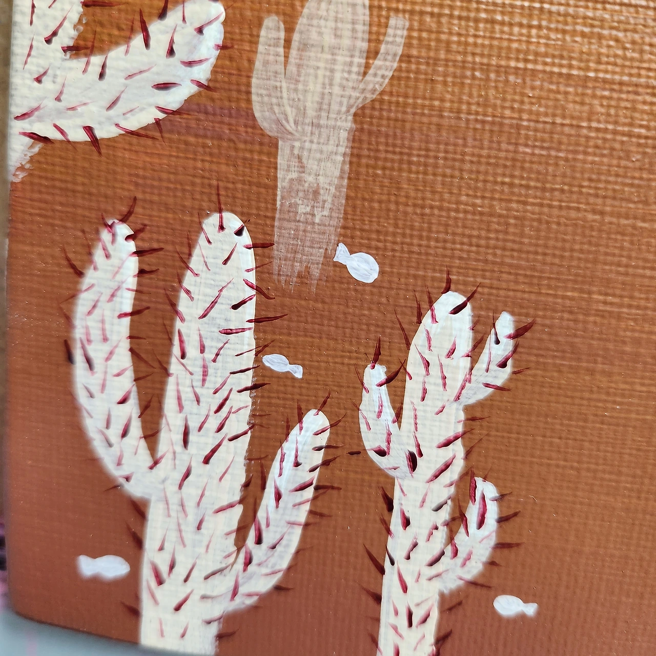 불교에서는 선한 삶을 살아 덕을 쌓으면 다시 태어나지 않는다고 한다. 작은 개미도 이 세상에 필요하기 때문에 존재한다. 우리의 삶은 주어진 사명 안에서 업보를 풀어가며 사는 고통의 시간들이다. 그래서 삶은 원래 힘들다. 슬픔과 고통이 되풀이되는 생의 굴레에서 벗어나는 길은, 어쩌면 스스로를 해치지 않고, 타인을 상처 주지 않는 데 있을지도 모른다. 그러나 사람은 사람들의 영향을 받는다. 때론 공생관계인 생명들처럼 때론 천적관계인 생명들처럼 사람은 사람에게 상처를 주는 존재이자, 치유가 되는 존재이다. 그림 속에서 선인장 주변을 헤엄치는 하얀 물고기들은 그러한 사람들을 의미한다. 그리고 물고기들과 어울려 있는 선인장은 피맺힌 감정을 안고 자신을 지키기 위해 무장하고 있다. 가시는 나를 지키기도 하지만, 때론 상대를 찌르거나 나를 찌르기도 한다. 사람들은 저마다 상처를 주며, 그러면서도 서로를 위로하며 의지하며 살아간다. 선인장들로 이루어진 바닷속 공동묘지처럼.