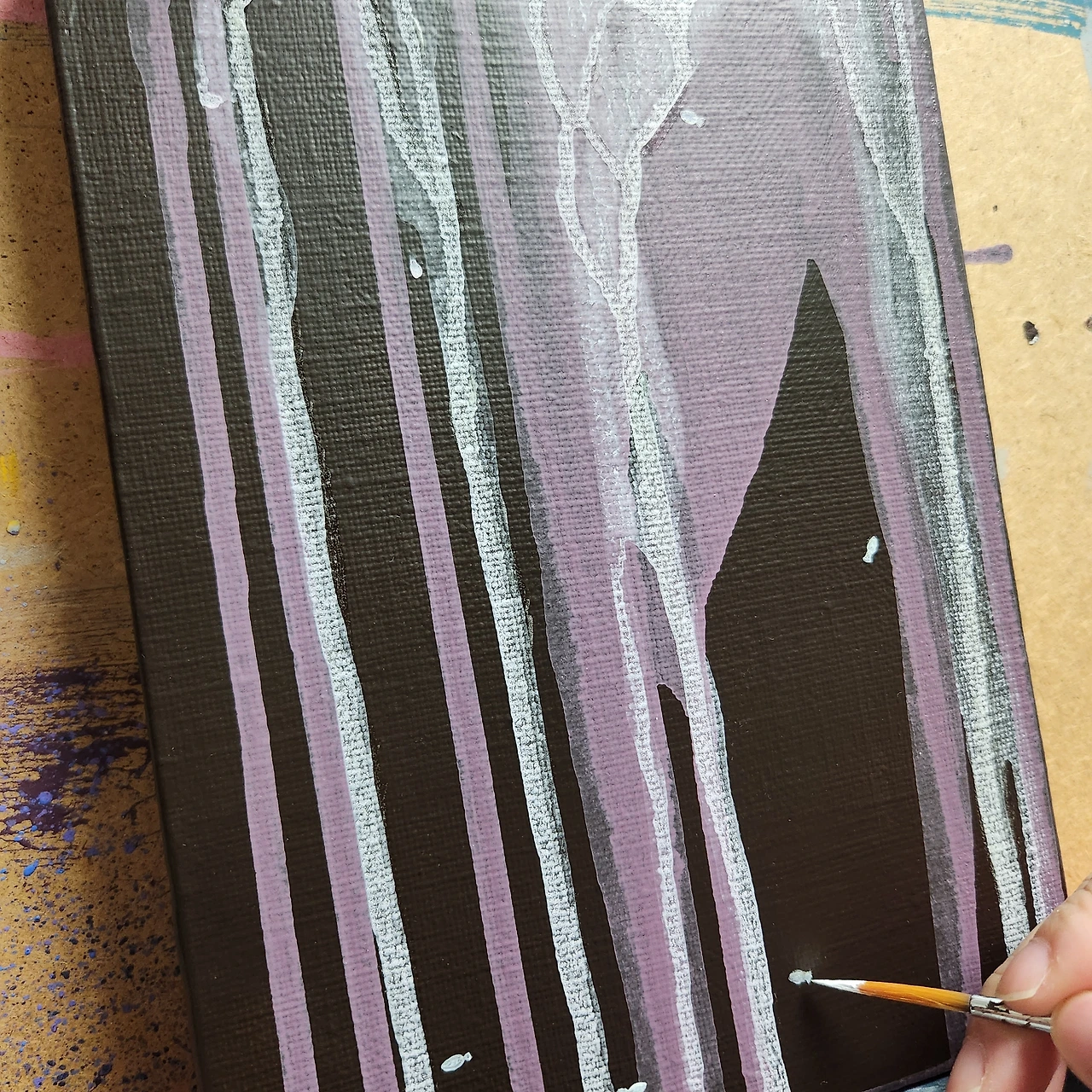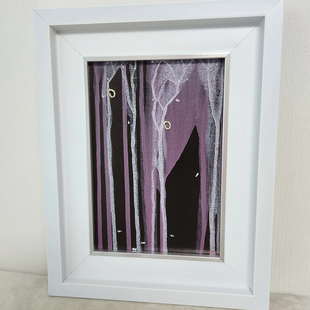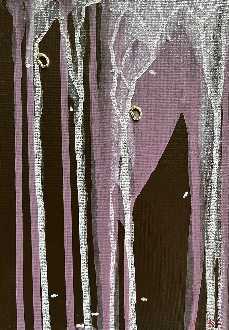 반짝이는 비즈를 붙였는데, 이것은 눈물방울이면서 동시에 삶이 맺은 열매이다. 그림 속의 작은 금속 링은 삶에서 지나온 어떤 약속의 흔적이기도 하다. 완전하지 않은 관계, 비워진 중심, 남아 있는 감정의 상징이다. 그것은 사랑이기도, 책임이기도, 혹은 단지 지워지지 않은 기억일 수도 있다.