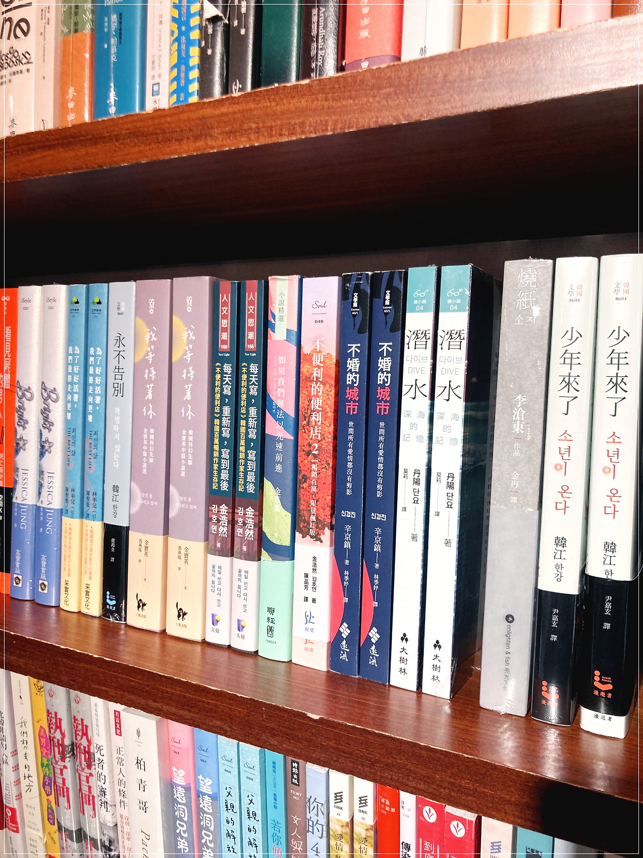 뭐, 책 사진이 거의 전부입니다. 너무 대충 찍었군요. 첫 사진은 장자 관련 책들입니다. 꼭 한 권을 사고 싶은데 뭐가 좋을지 몰라 엄청 고민했습니다. 그 결과 구입한 책은? 맨 마지막 사진의 <장자해밀>인데요. 풀이하자면, <장자의 비밀을 풀다> 정도가 될까요? 그림과 짧은 글로 비교적 쉽게 쓰인 것 같아서 얼른 샀습니다. 하하. 소비는 즐겁습니다. 그리고 중간중간 <인간실격>과 <나생문>이 보입니다. 둘 다 집에 있고, 또 수집병이 도져서 살 뻔했습니다. 너무 좋아하는 책들이라서요. 간신히 내려놓고 이소룡 오빠의 멋진 모습도 한번 다시 보고 한국문학 코너에서도 오래 머물렀습니다. <불편한 편의점 2> 책은 이곳에서도 참 예쁘네요. 반가운 한국 책들! K-Story도 더욱더 흥했으면 좋겠습니다.