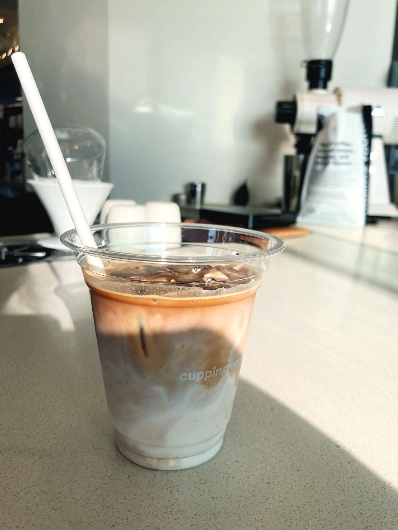 서점 다음에 간 곳이 하버시티 내 <커핑룸(Cupping Room)>이라는 카페입니다. R과 친구가 쉬고 있다고 해서 찾아갔는데 사람이 진짜 너~~~~~~무 많아서 한참 기다려 1인석을 배정받았습니다. 침사추이의 모든 곳이 그런지는 모르겠지만, 아무튼 어디에나 사람이 많고 카페는 작고 앉을 곳은 많지 않아서 수요 대비 공급이 현저히 부족합니다. 저도 번호표 뽑고 한참 기다려 바(Bar) 형태의 1인석에 간신히 앉았습니다. 이곳의 아이스 라떼 강추합니다!