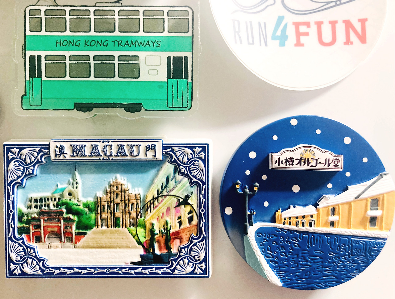<삼국연의>, <서유기>, <수호전> 다 반가워서요. 여기에서는 책 대신 홍콩 마그넷을 하나 샀구요. 생각보다 종류가 아주 다양하지는 않더라구요. 엄마가 스노볼을 좋아하셔서 홍콩과 마카오에서 하나씩 샀는데 이것도 종류가 많이 없어서 한두 개 중에 골라야 했습니다. 그래도 있는 게 어딘가 하는 마음으로 감사히 들고 왔습니다. 나중에 두고 보면 그때가 생각나고 기분이 좋더라구요. 마그넷 하니까 생각나는데 이번에 홍콩 짐을 싸다가 작년 이맘때 다녀온 오타루 마그넷을 발견했어요. 소중히 들고 와서는 처박아 두고 잊은 채 그대로 1년을 보냈습니다... 엊그제 홍콩 마그넷과 나란히 붙여 두었습니다. 이렇게 생겼어요. 마카오 마그넷이 아주 화려합니다.