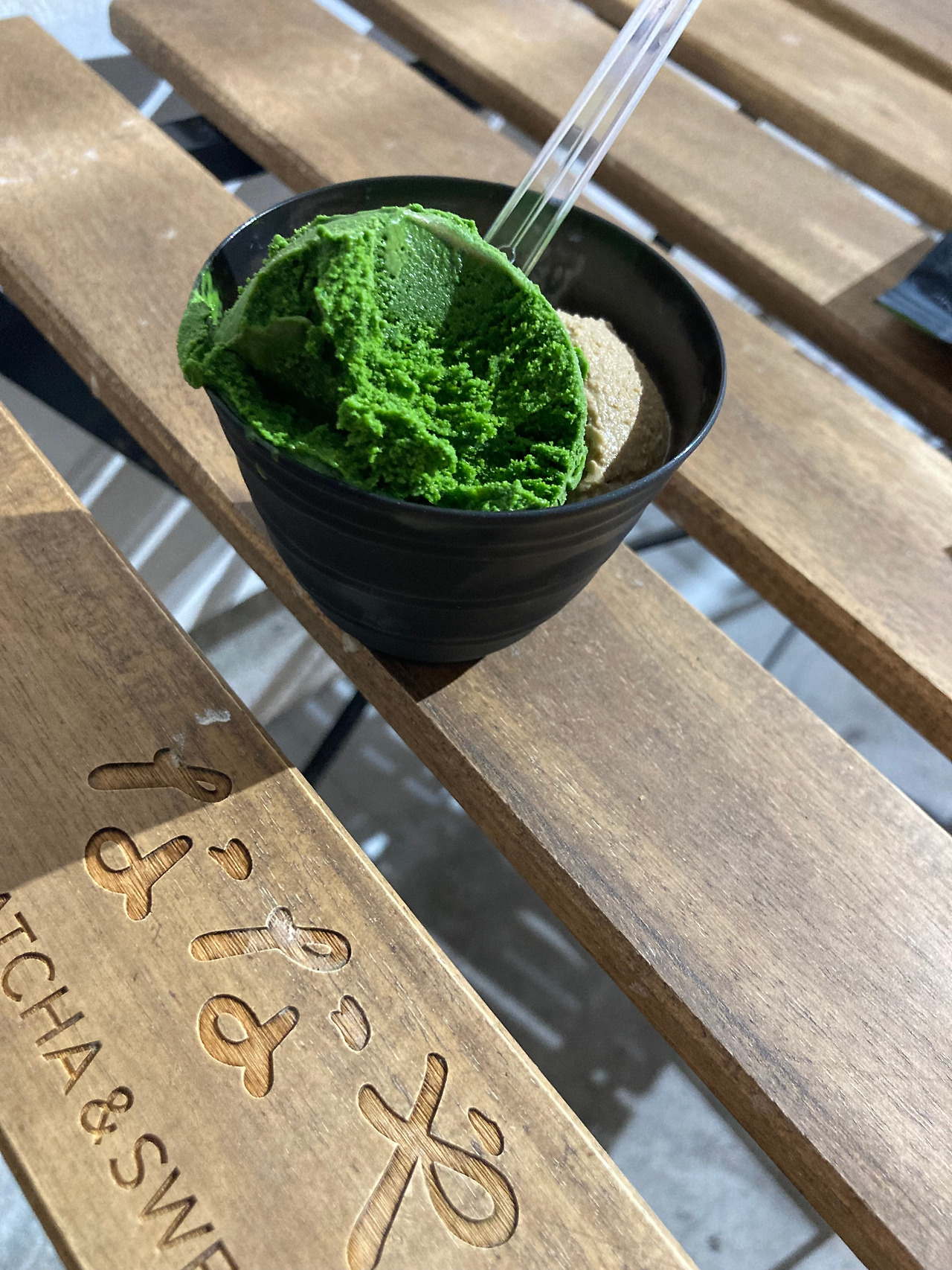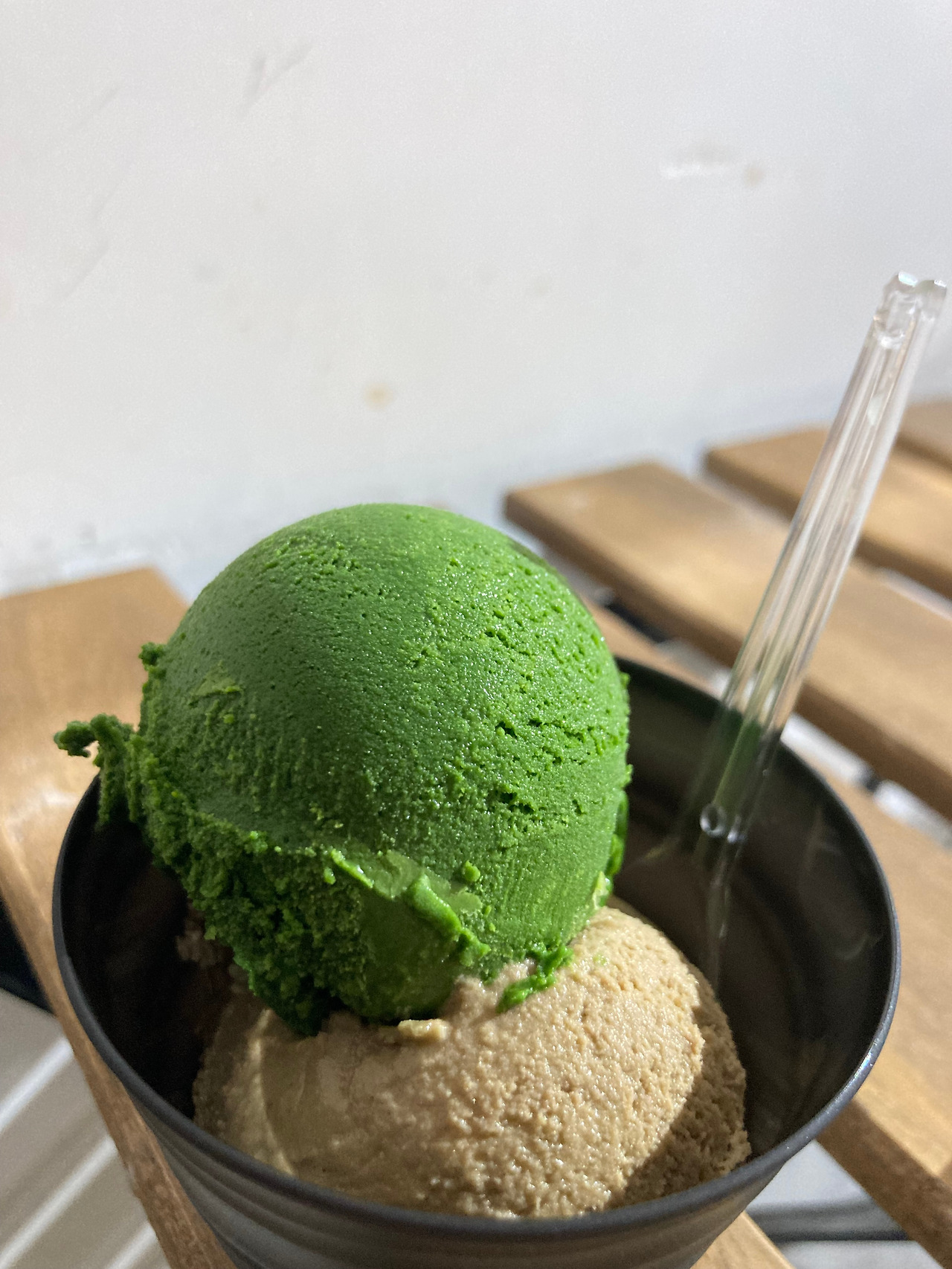 색깔이 무척 초록초록합니다. 녹차 마니아로서 꾸덕한 녹차 맛이 아주 좋았습니다. 가장 마지막 단계라고는 해도 막 쓰거나 그렇지는 않았구요. 맛나게 잘 먹었습니다. 호지차는 제 입에는 조금 달았는데 녹차와의 조화가 괜찮았습니다. 한 가지 맛과 두 가지 맛 가격에 큰 차이가 없어서 두 가지 맛으로 골랐습니다. 대부분 두 가지 맛으로 드시더라구요.
