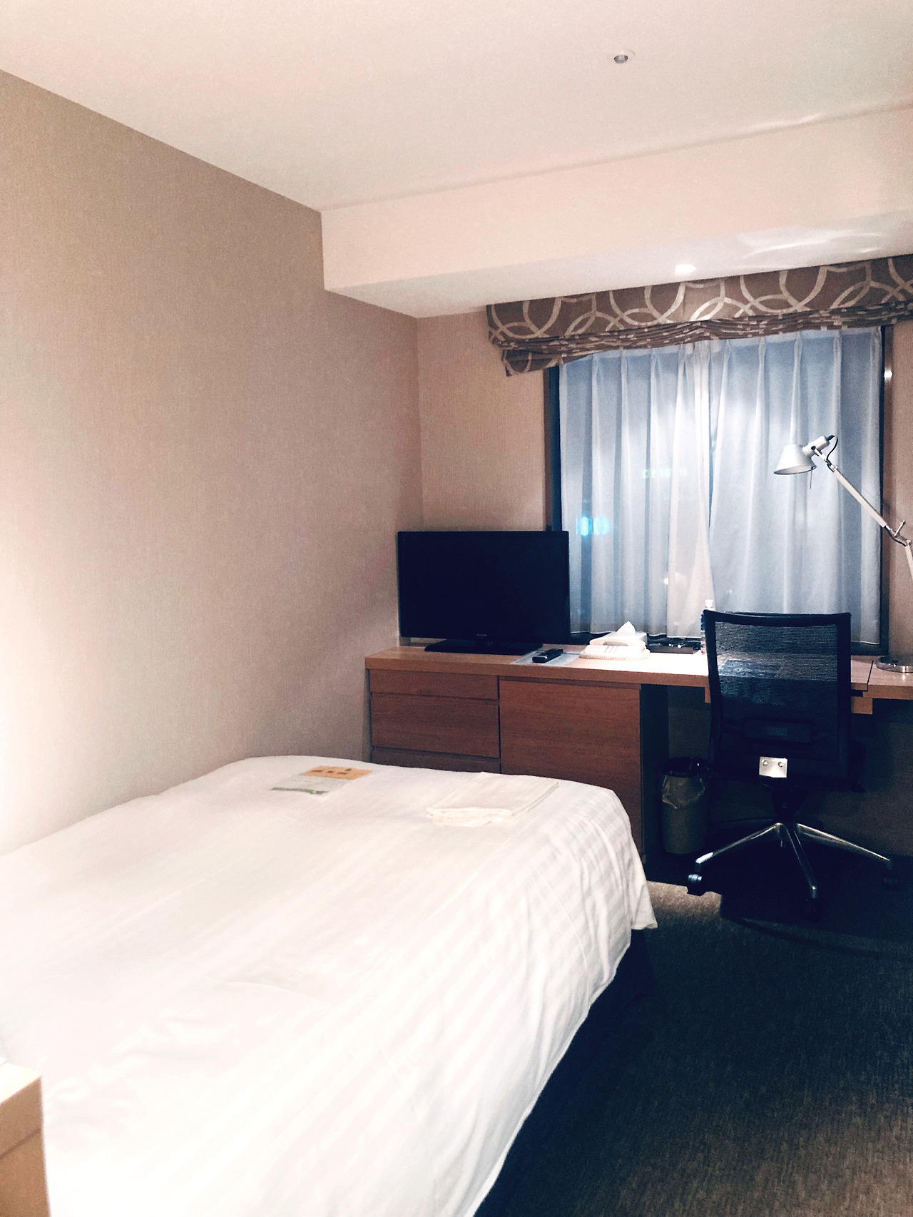 숙소는 시즈오카 역 바로 앞에 딱 붙어 있는 곳이었습니다. 공항버스에서 내리자마자 전면에 보입니다. 저 같은 길치에게는 더할 나위 없는 위치였습니다. 개인적으로 무척 만족했구요. 싱글룸 기준으로 가성비도 아주 훌륭했습니다. 이번에는 침대를 헝클어뜨리기 전에 사진부터 찍어 보았습니다. 오, 어쩐 일로? 약간 발전한 기분이 듭니다. 캐리어도 무사히 잘 열었습니다. (홍콩 여행기 (1)편 참조)