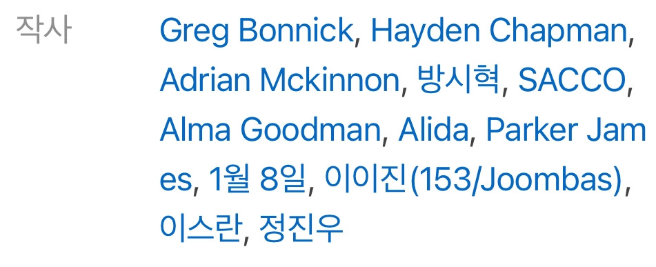 초-메이저-히트 작사가의 경우 멋있게 단독으로 이름을 뙇! 올리지만, 요즘에는 갈수록 다수작사가 많아지고 있어요. 대부분의 가요들이 그렇답니다~