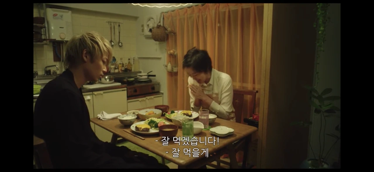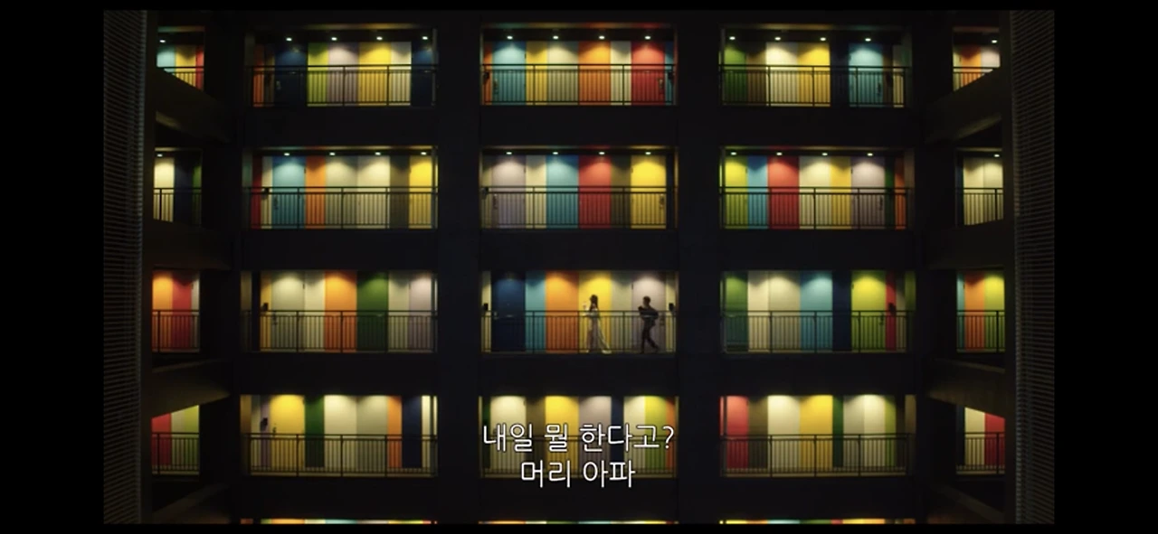 개인적으로 가장 아름답다 생각한 장면이었어요. 집으로 가기전 복도를 지나는 리리코와 매니저입니다. 알록달록한 벽이 보여요. 그녀의 집은 새빨갛고, 매니저의 집은 노랗지만 그 집 밖에는 알록달록한 세상이 있어요. 환한 빛도 들어오고 있어요. 하지만 그녀들은 이 아름다운 색을 이제 가질 수 없어요.