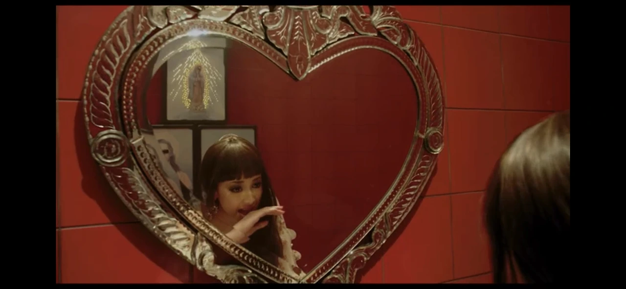 특히 화장실은 눈이 찢어질 정도로 새빨개요. '어떻게 저런 곳에서 똥싸냐?'라는 생각이 들 정도로요. 이 공간은 영화에서 자주 등장합니다. 리리코가 처한 지옥같은 삶을 잘 보여주거든요. 화장실 거울 속에 비치는 그림 보이시나요? 마리아와 그리스도 초상화입니다. 하지만 특이하게도 눈 부분이 검열돼있어요. 검열bar하나만으로도 신성한 그림이 다소 왜설적으로 느껴집니다. 그리고 그림 위엔 'CAST'라는 글자가 살짝 보입니다. 캡쳐에는 못담았네요. CAST는 '배우'라는 뜻이 있죠. 즉, 그림 속 마리아와 그리스도는 오리지날이 아닙니다. 그럴듯해보이지만 모두 가짜, 인위적인 인물임을 나타냅니다.