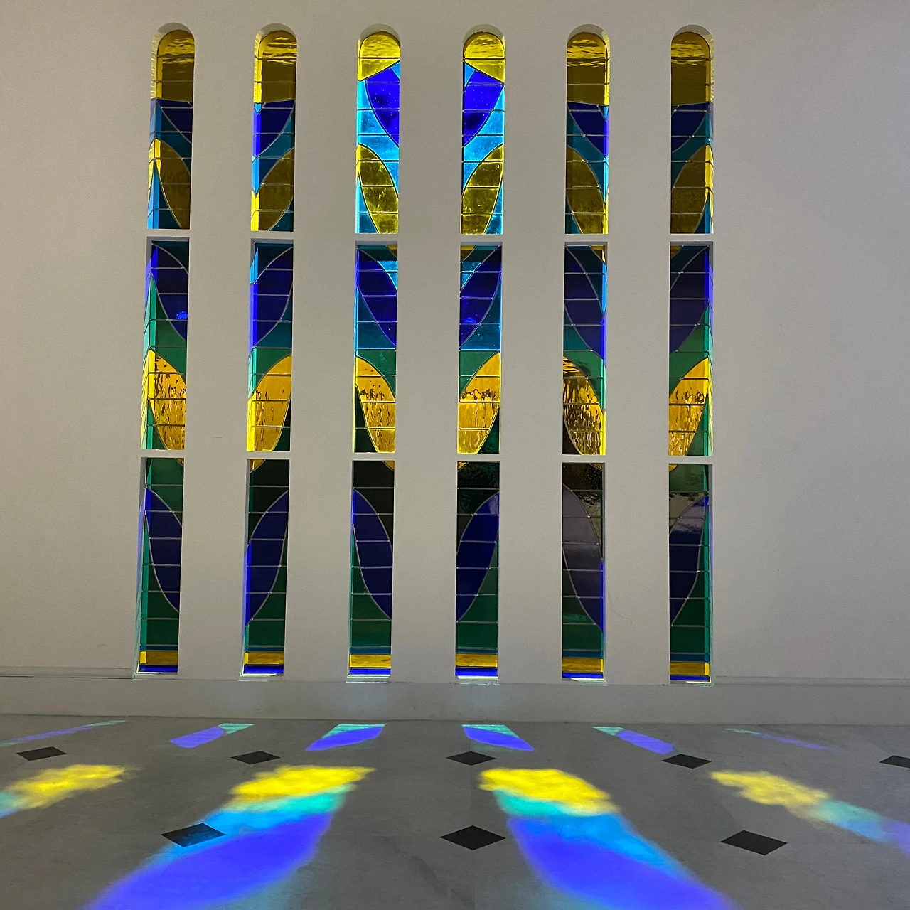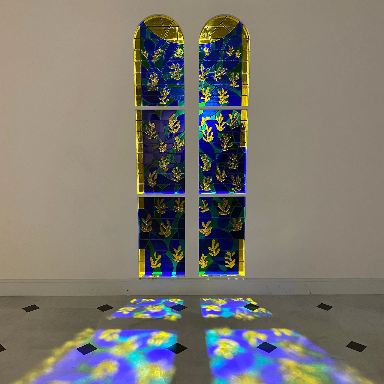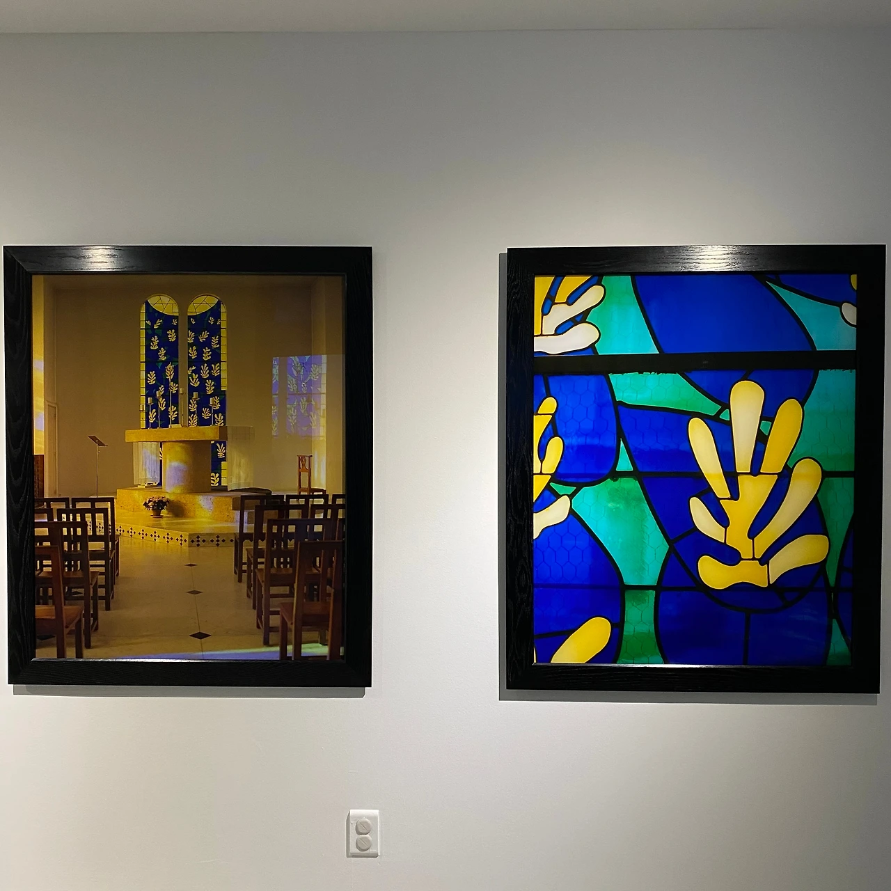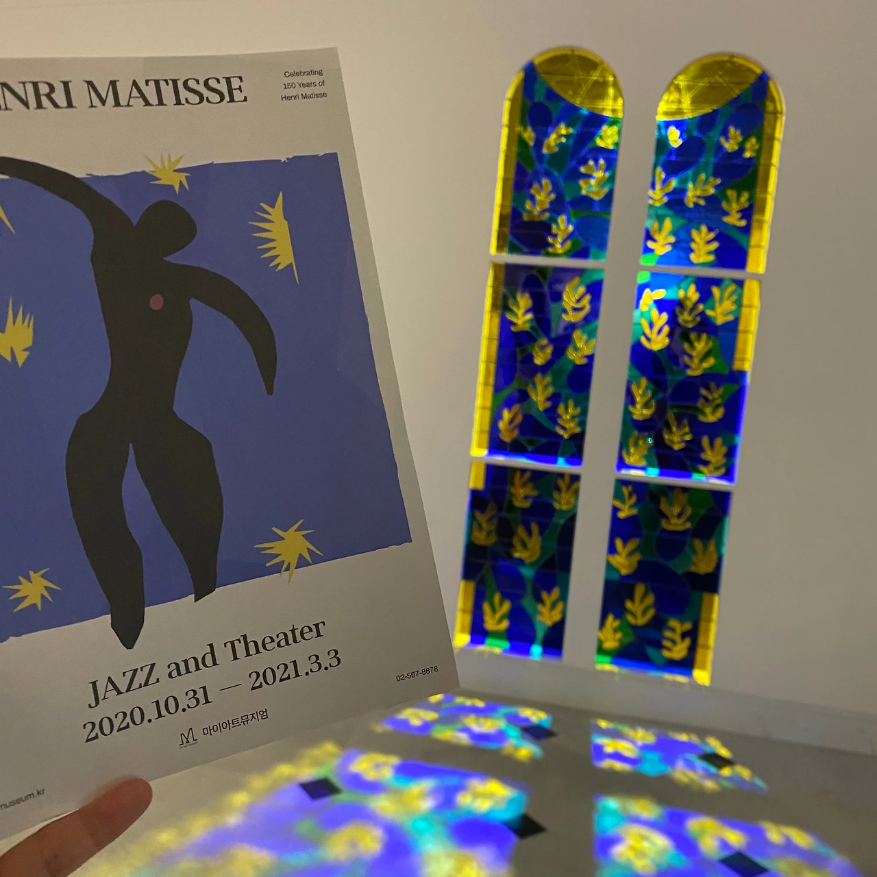 파랑, 노랑, 초록 3색의 스테인드글라스가 참 아름답습니다. 실제 창은 전시회보다 사이즈가 더 크겠지만 전시회에 설치된 창으로도 아름다움이 잘 느껴졌어요. 햇빛을 받아 찬란히 빛나는 자연의 색채를 보고 있노라면 어째서 마티스가 색을 사랑했는지 알 수 있어요.